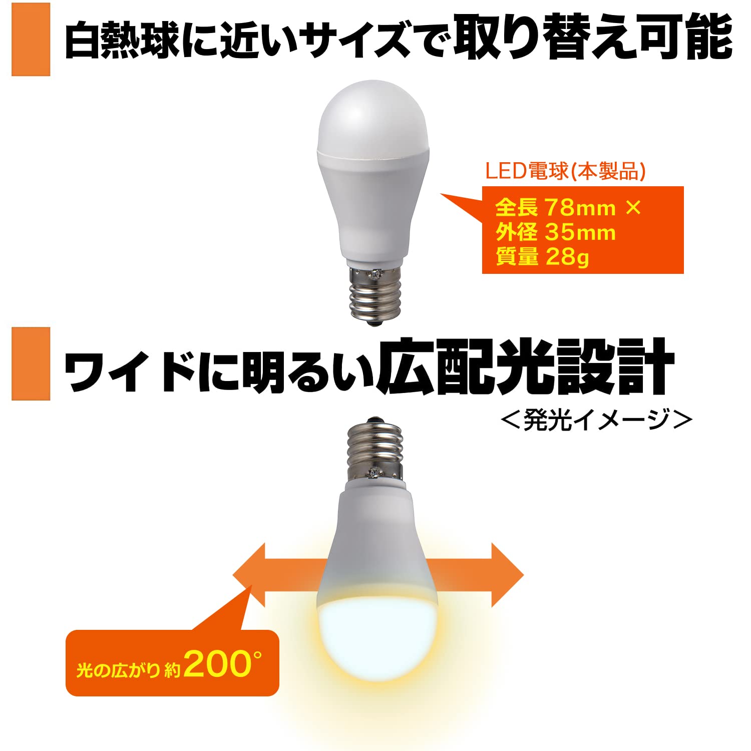■交流電源:100V 50/60Hz共用 ■口金:E17 ■サイズ:全長78X外径35(mm) ■質量:28g ■定格消費電力:4.1W ■定格入力電流:75mA ■設計寿命:40000h ■全光束:440lm ■エネルギー消費効率:107.3lm/W ■光色:電球色相当 ■屋内用