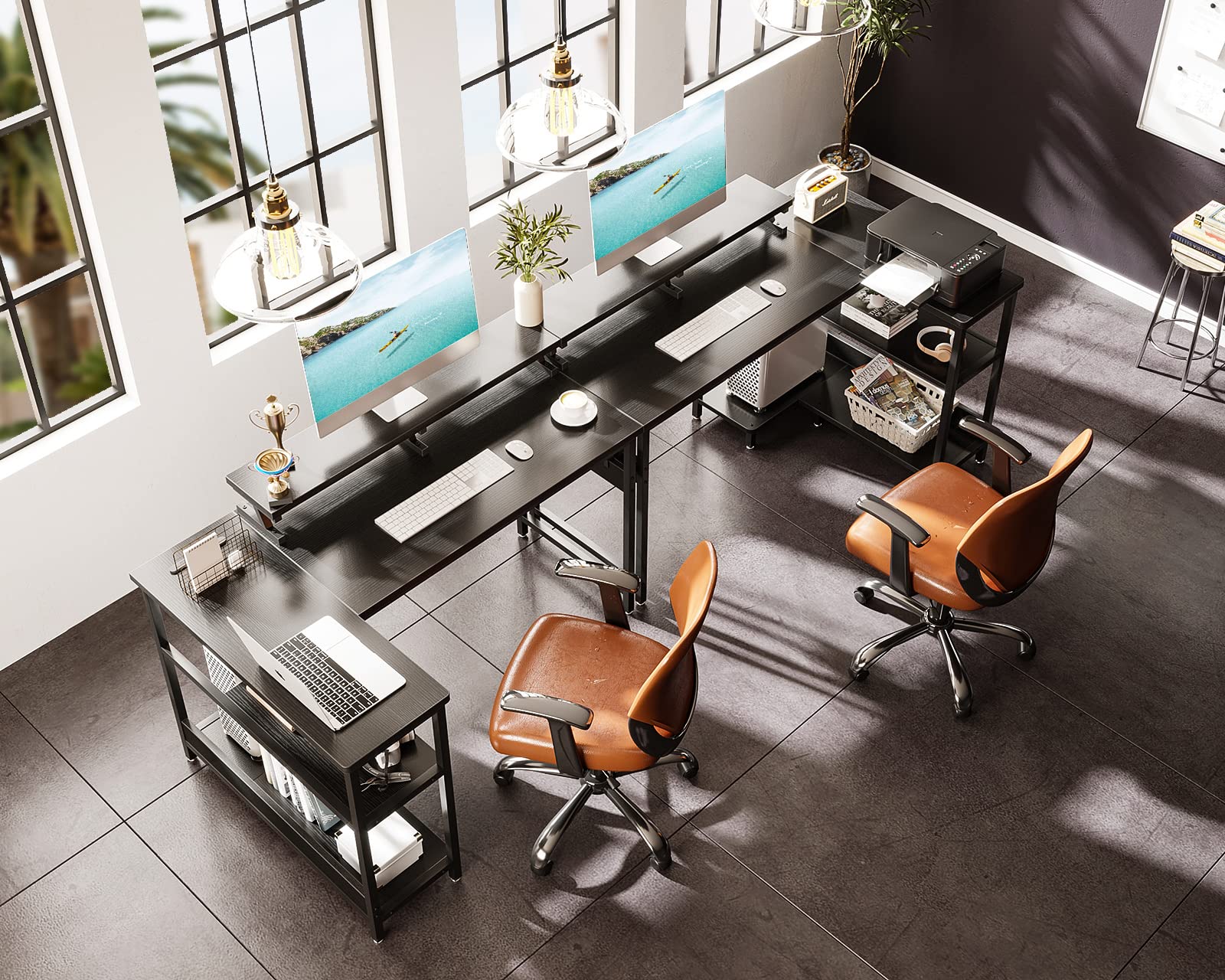 【ゲームと仕事両立】L字ゲーミングデスクは実用性が高く、ゲームプレイ、在宅勤務、勉強机、書斎机など様々なシーンで大活躍!お部屋のレイアウトに合わせてラックの位置を変更できます。モニター台を利用し、目線をあげて作業時の姿勢を改善し、テレワークが快適になり、作業効率も格段に上がります。