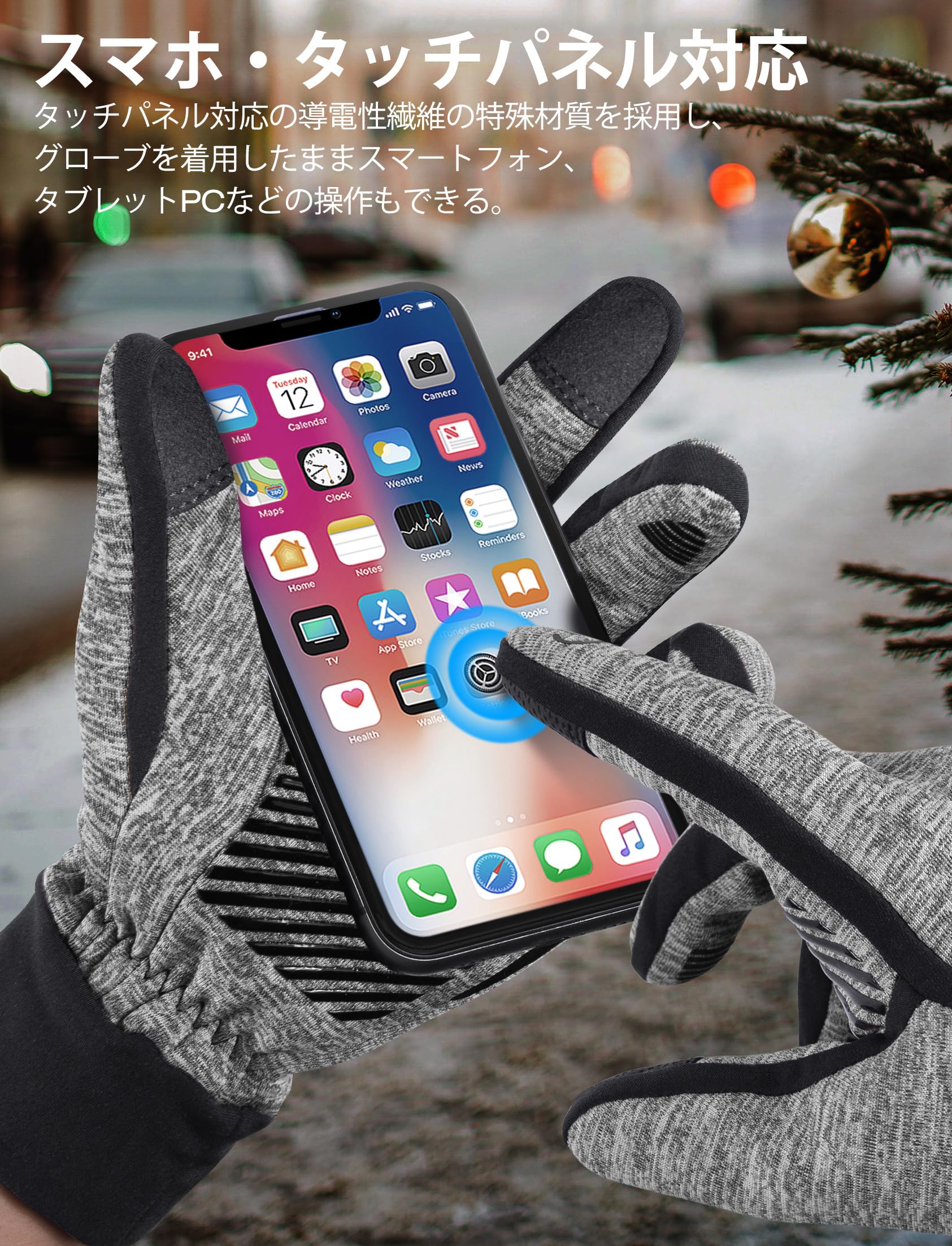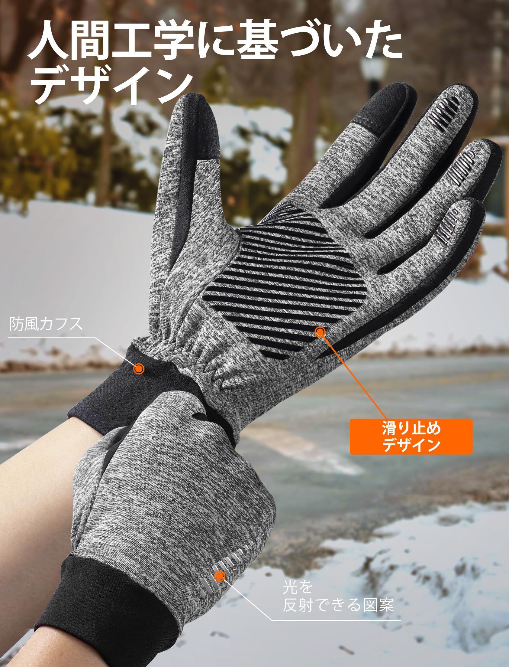 『滑り止めデザイン』手のひらと指に十分なシリコン粒子を装備し、グリップ力と耐摩耗性を効果的に向上させています。 物を掴む際にしっかりホールドできます、アウトドア、スポーツから日常まで、冬や春先のハイキング、トレッキング、サイクリングなどにいいかけ心地を実現しています。