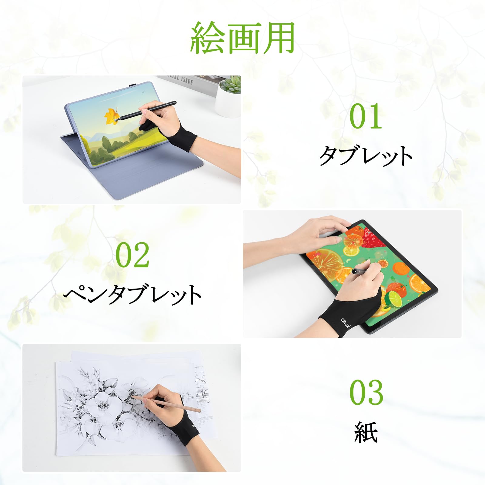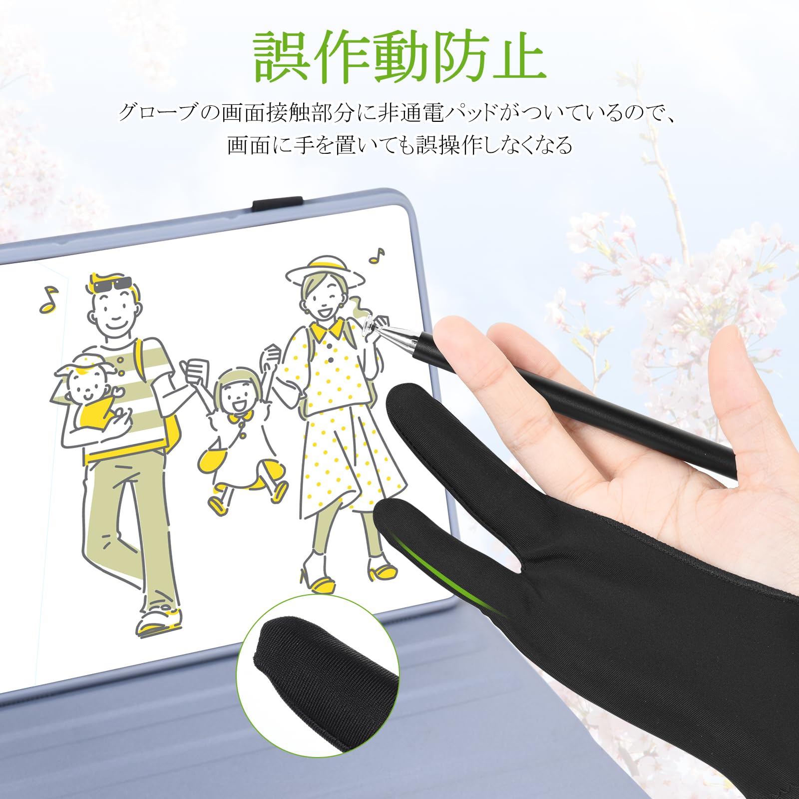 【誤作動防止】グローブの画面接触部分に非通電パッドがついているので、絵を描くときに画面に接触した手による誤操作を防止お絵描き手袋です。ご注意:1.ペンタブレット、ライトボックス、グラフィックスモニター等利用時の誤動作防止や絵を描く時の汚れを減らすことができますが、完全に無効化することはできません。2.誤動作対策の部分は絵を描く時や書類を書くときのひら側で、指ではありません