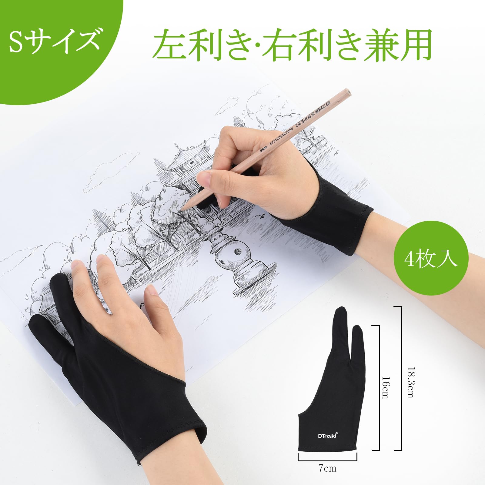 [OTraki] 二本指グローブ 4枚入 7×18.3CM 子供向け Sサイズ 防汚 通気性 超軽量 快適 ライカ繊維 グローブ Paint gloves お絵描き手袋 液晶ペン タブレット用 二本指手袋 左利き 右利き 通用 黒