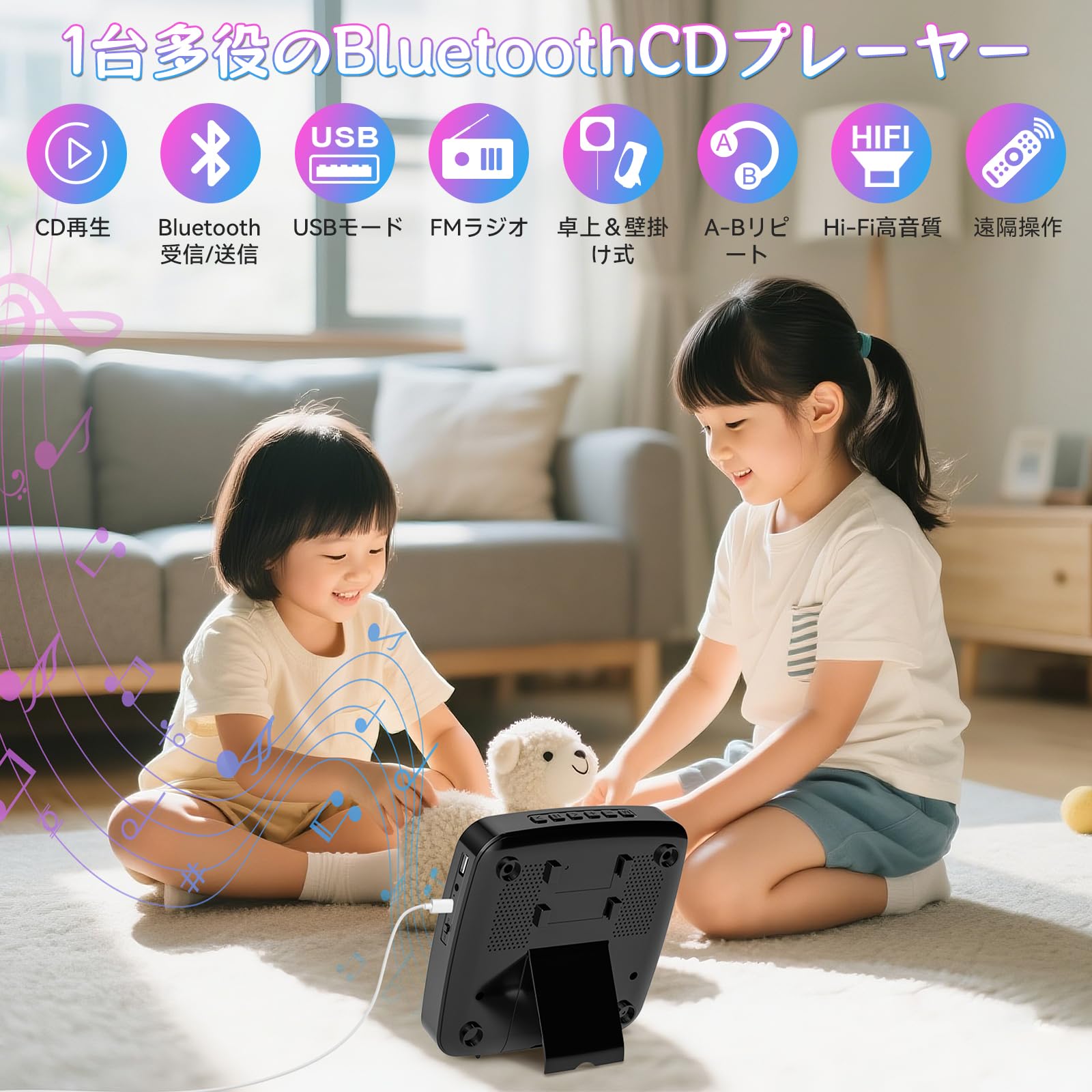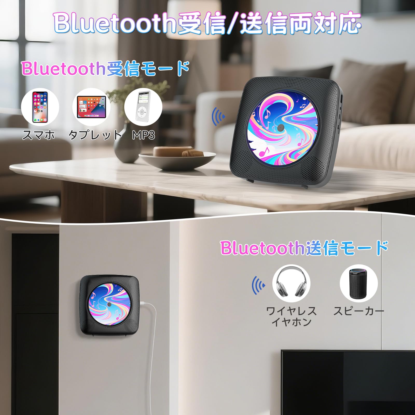 【Bluetooth受信/送信両対応のCDプレーヤー:】ご注意:このCDプレーヤーは電池内蔵はなく、電源に繋いでいないと使用できません。Bluetooth受信と送信両方の機能を搭載して、Bluetooth受信モードで、スマホ、タプレット、MP3などの設備と接続でき、これら設備の音楽を楽しめあす。また、Bluetooth送信モードで、ワイヤレスイヤホン、スピーカーなども接続が可能で、より自由により多い音楽を楽しめます。