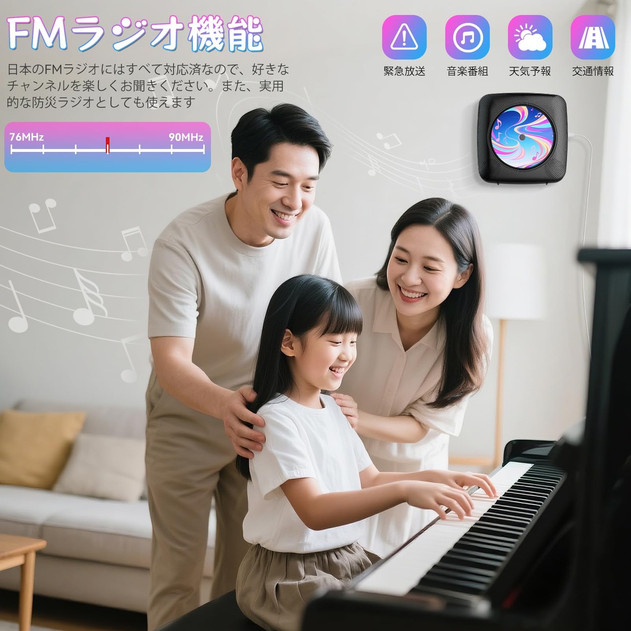 【FMラジオ&USB給電式:】FMラジオ機能(受信周波数:76~108MHz)は日本のFMラジオ周波数76~90MHzにも対応済なので、実用的な防災ラジオとしても使えます。また、USB給電式なので、付属するUSBケーブルで、5V/2AのUSBアダプターに接続して使用できます。リビングルームや寝室、パーティーなどの場合にも自由に音楽を楽しめます。ご注意:必ず5V/2AのUSBアダプターをご使用ください。5V/1A充電器を使用すると、ディスクの詰まりや読み込み不良が発生する場合があります。