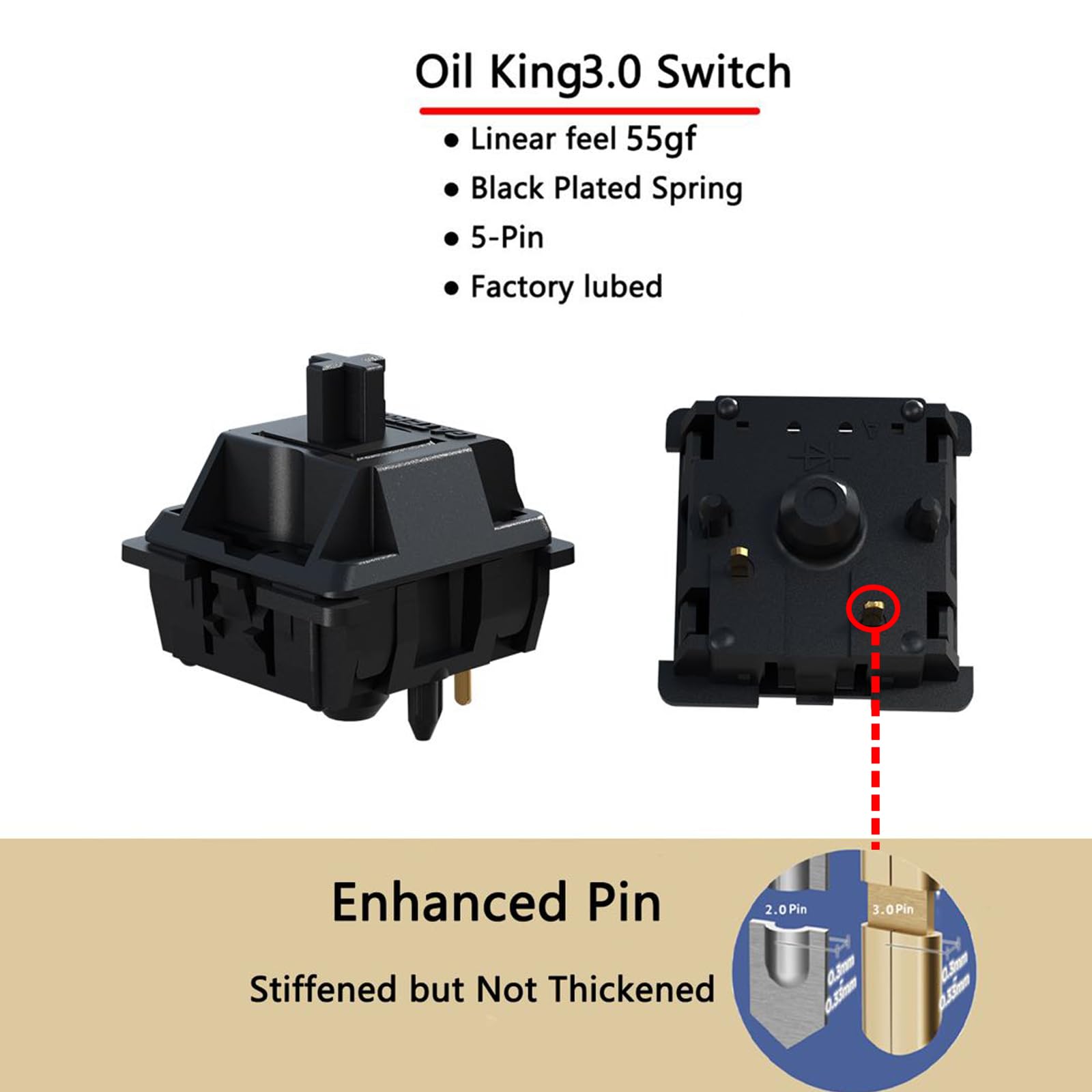 [特徴]:2.0バージョンと比較して、オイルキング3.0スイッチは、トリプル強化ピン設計で、簡単に曲がらない、スイッチの安定性と寿命を向上させ、硬いですが、厚くなっていない;酸化を拒否するために、オリジナルの合金接点とブラックメッキスプリングを採用し、最大8000万回の機械的寿命。