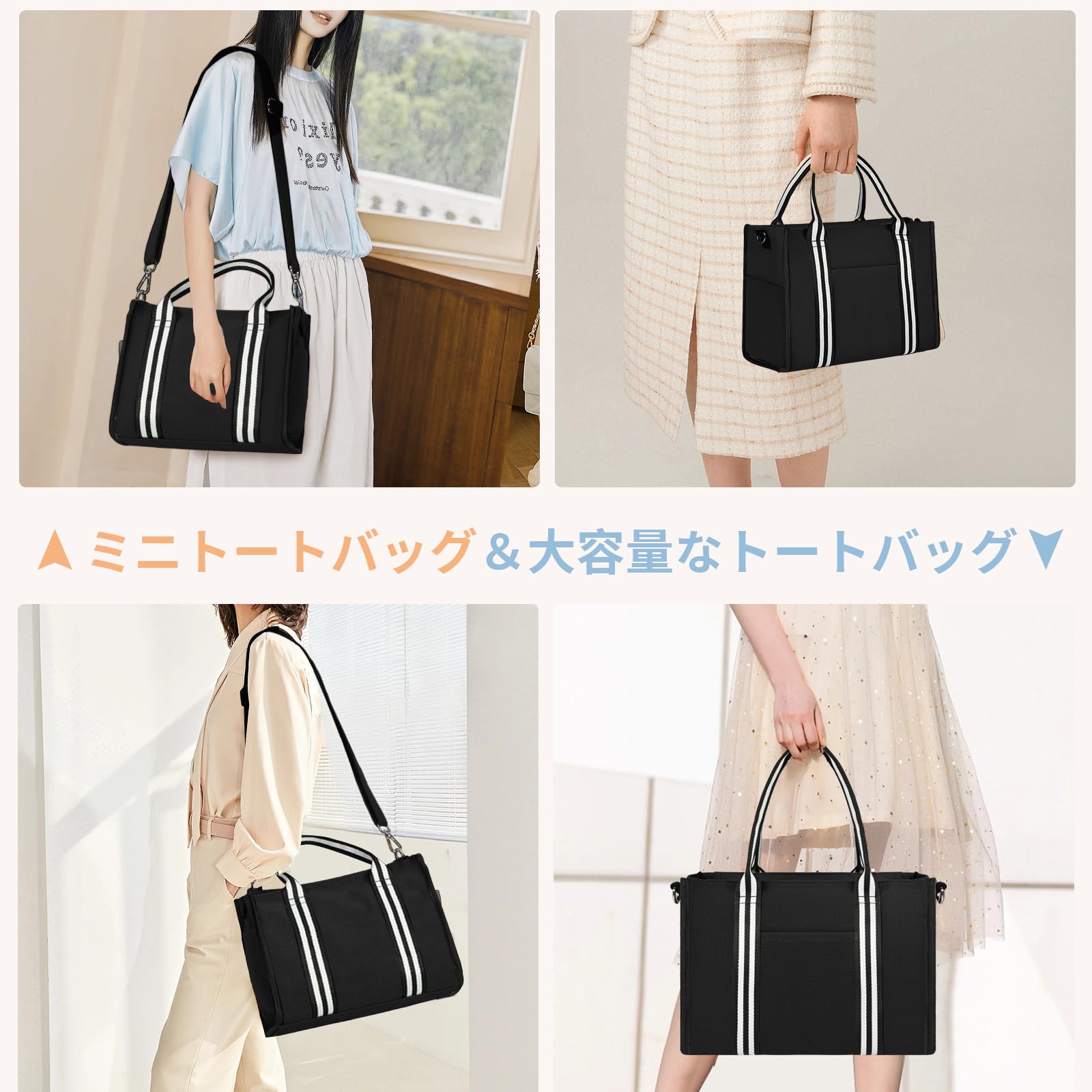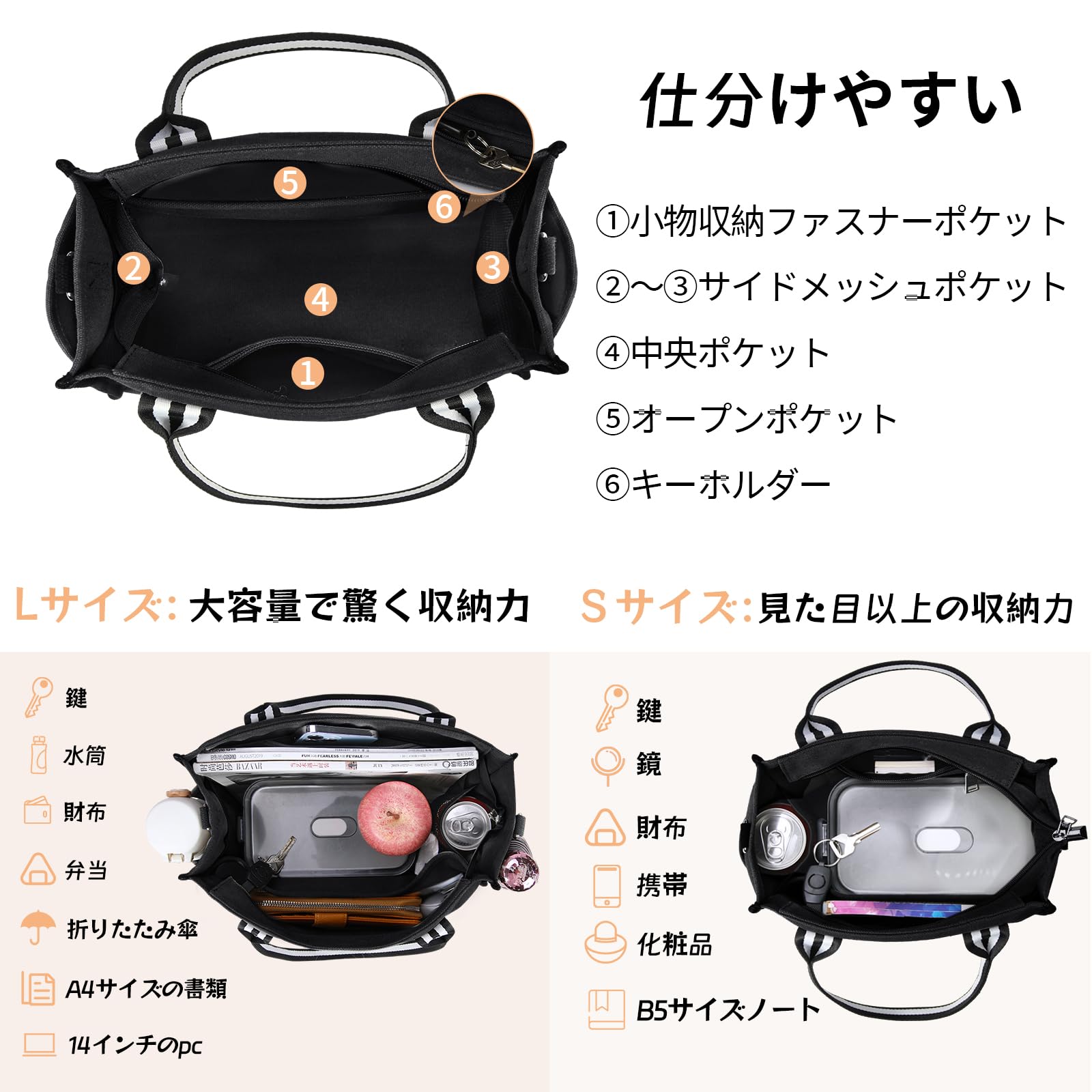 サイズ:Lサイズ:長さ36 ㎝ 幅13 ㎝ 高さ27 ㎝、重さ:0.55 kg。Sサイズ:長さ26 ㎝ 幅12 ㎝ 高さ20 ㎝、重さ:0.4 kg。LサイズのトートバッグはA4サイズの書類と13インチPCを収納できて、通勤と通学が似合います。Sサイズのトートバッグは可愛くて、ちょっと出かけ時に必要なスマホーと財布などの小物を収納できます