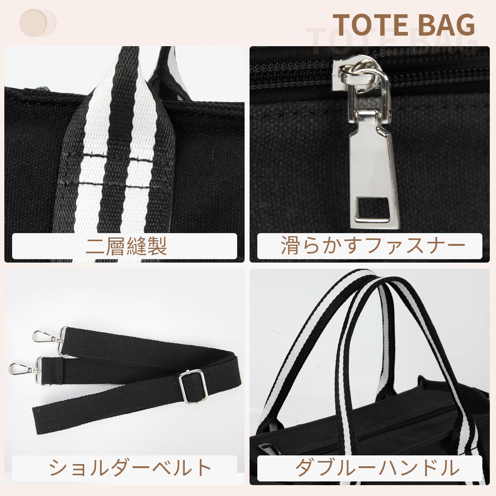 2way仕様:手持ちと斜めかけの2wayの使い方ができます。キャンバス生地を採用したダブルーハンドルは縫製を強化した、高い耐久性があります。なお、調節可能なショルダーベルトを付属しており、両手が空いてない時にクロスボディバッグとして使用できます