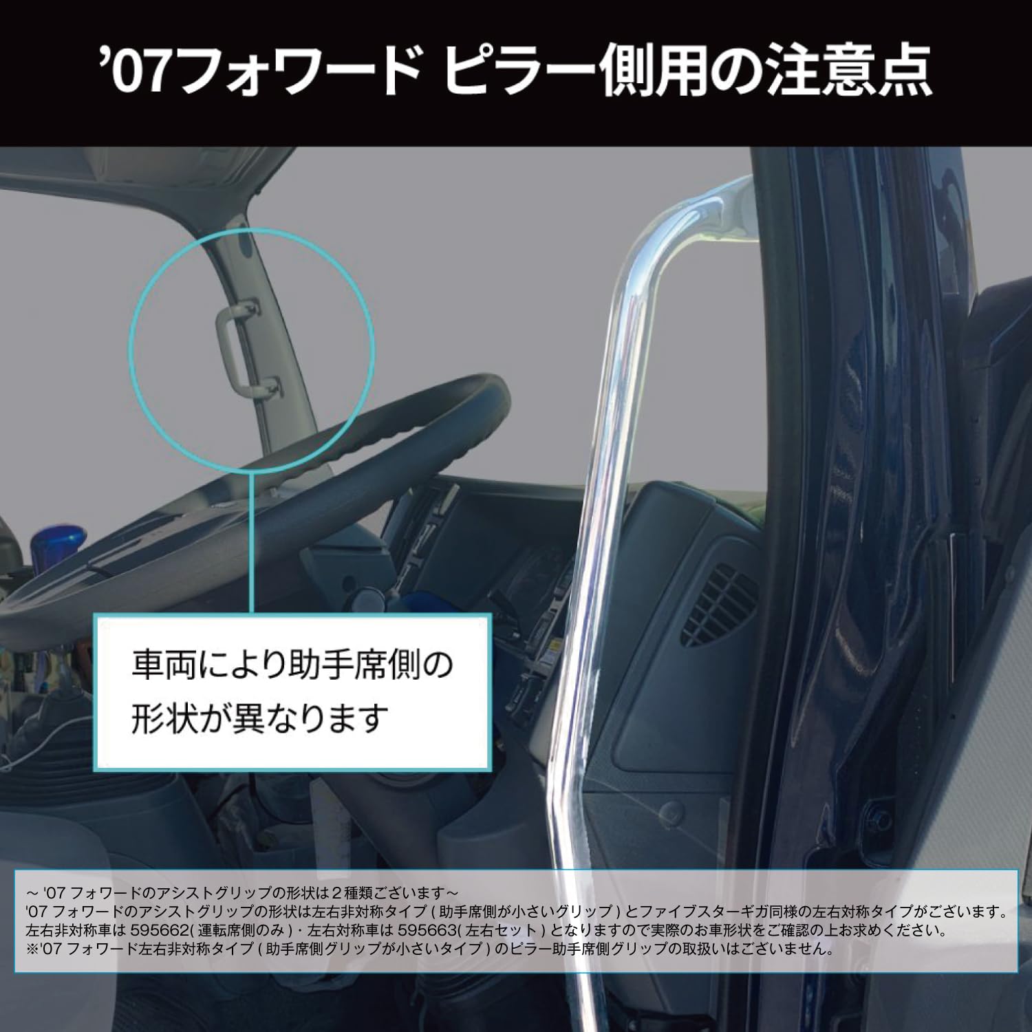※'07フォワードのアシストグリップの形状は2種類あります。左右非対称のタイプ(助手席側が小さいグリップ)と、ファイブスターギガ同様の左右対称タイプです。左右非対称車は595662(運転席側のみ)、左右対称車は595663が対象となります。車両の形状をご確認の上お買い求めください