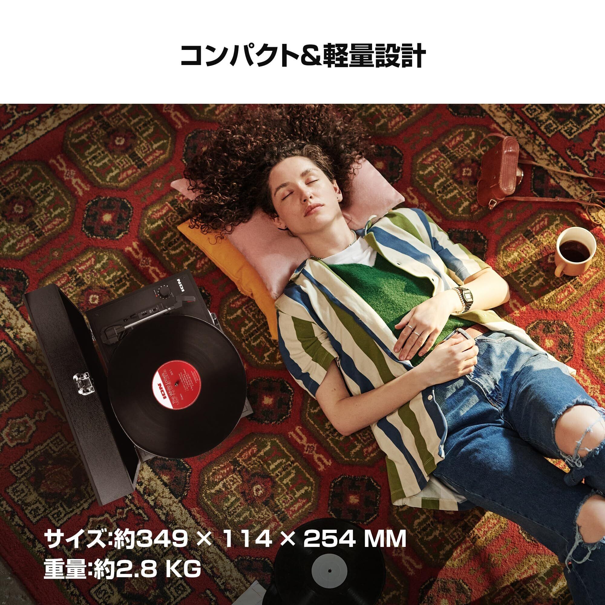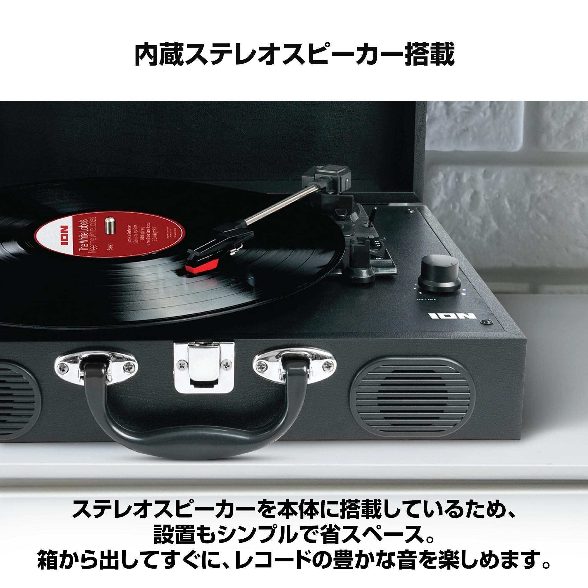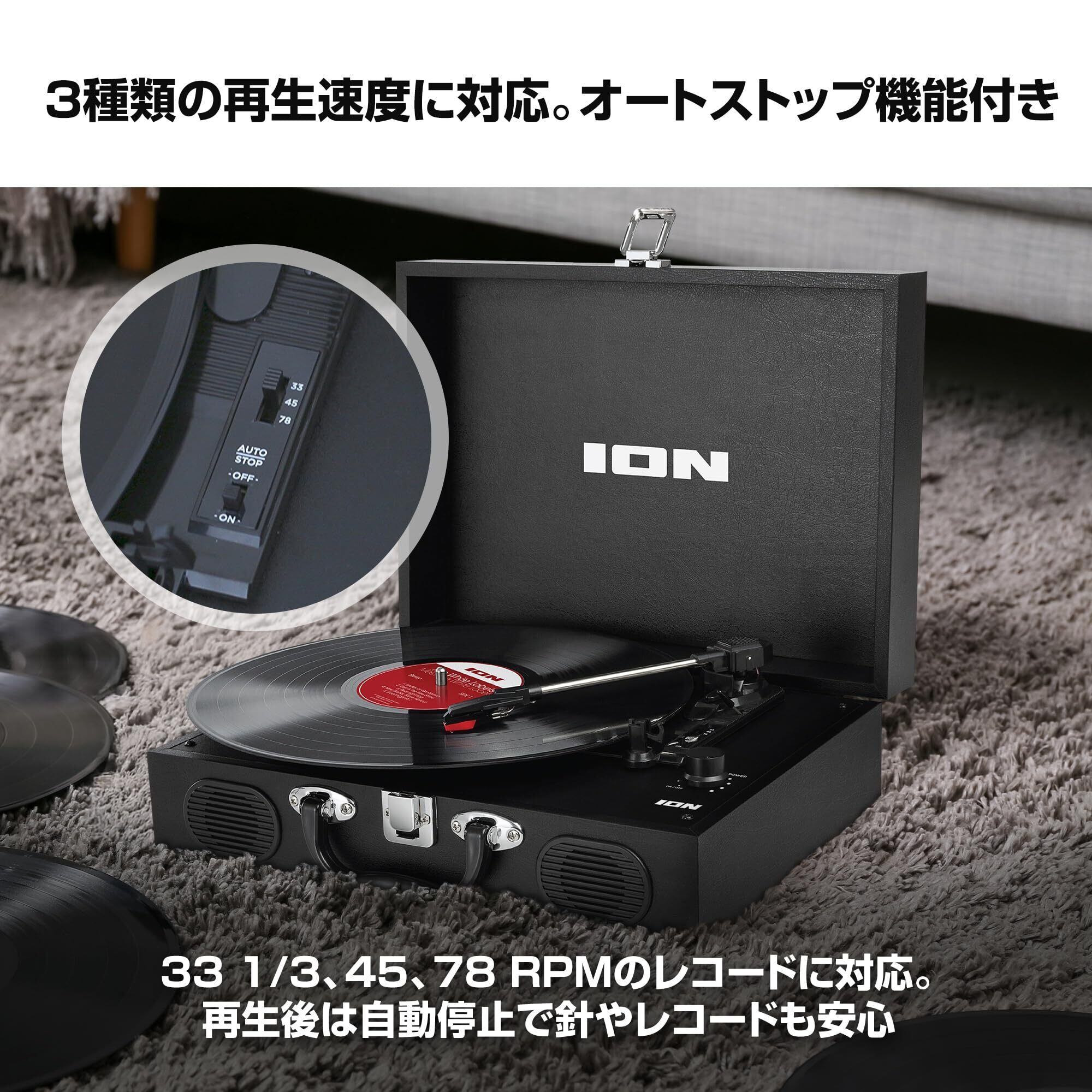 【新着商品】ION Audio レコードプレーヤー スピーカー内蔵 ポータブル スーツケース型 持ち運び 電池でも稼働 3つの回転スピードに対応 RCA出力端子搭載 針付属 アイオン Vinyl Transport 黒