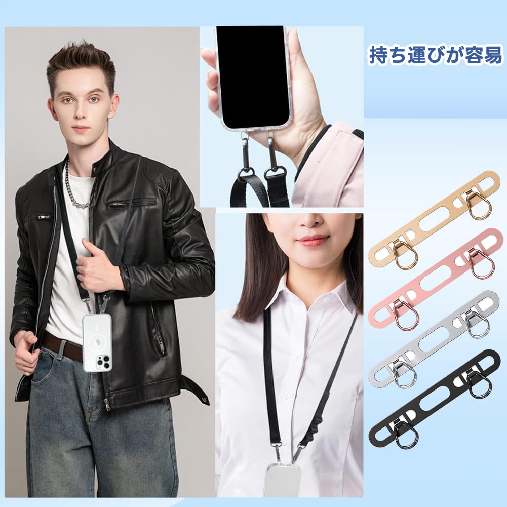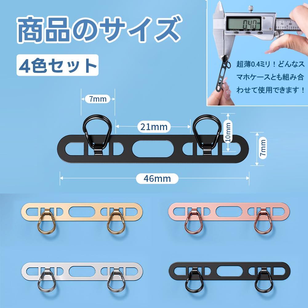 【4色セット】スマホのストラップを安心して楽しめるストラップホルダー4点セットが登場。 サイズ:46x7mm、厚さ0.4mm、カラー:シルバー、ブラック、ローズゴールド、シャンパン。 様々な携帯ケースにマッチします。