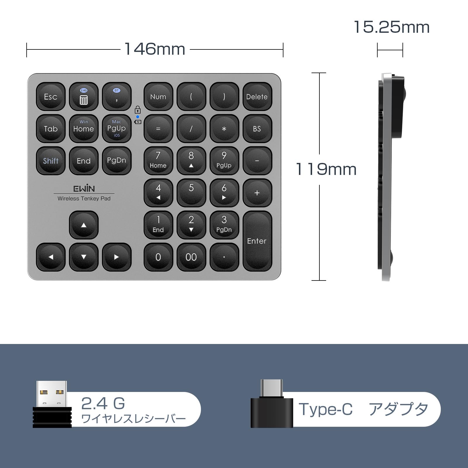 Ewin テンキー Bluetooth5.2 / 2.4G接続 2台接続 Mac対応テンキー ワイヤレス 数字キーボード Bluetoothキーボード 超薄軽量 numlock連動 Type-C充電 37キー 日本語対応 iOS iPadOS Mac Windows Androidに対応