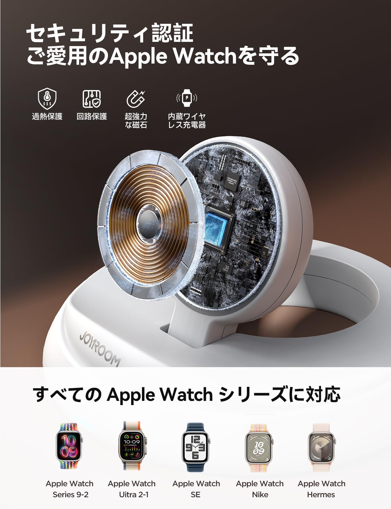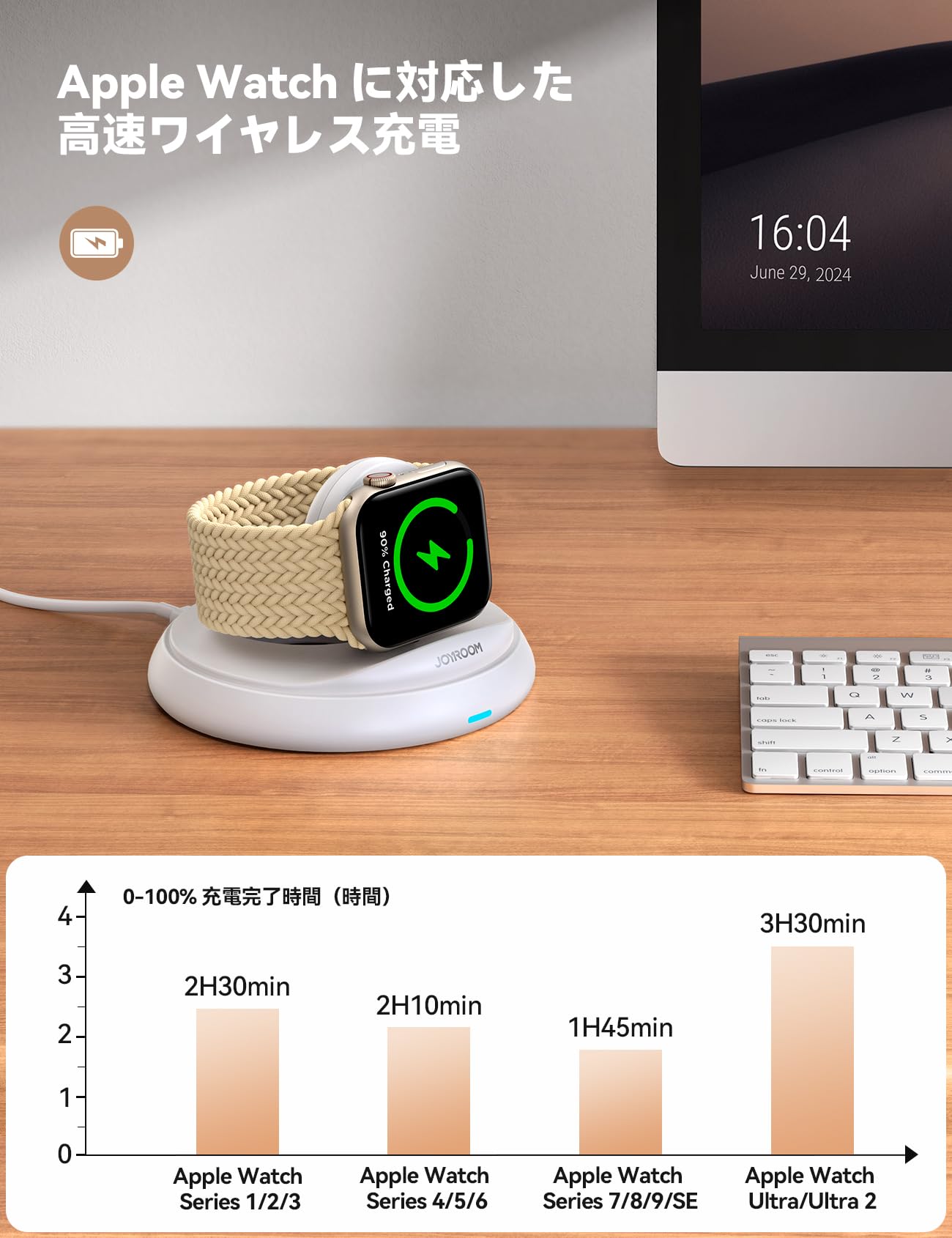 【CE&RoHs国際認証·安全充電·過充電&過熱防止】Joyroomのアップル ウォッチ 充電器は一体型のapple watch充電機で、組み立てる必要はありません。内蔵の強力な磁気充電器を備えており、Apple Watchを上に置くだけで充電できます。付属のUSB-Cケーブルを接続するだけで、ライトが点灯して充電が始まります。CEおよびRoHS国際認証を取得し、安全な充電を実現し、安心してご利用いただけます。時計が完全に充電されると、自動的に電源が切れ、過充電や過熱を防ぎます。
