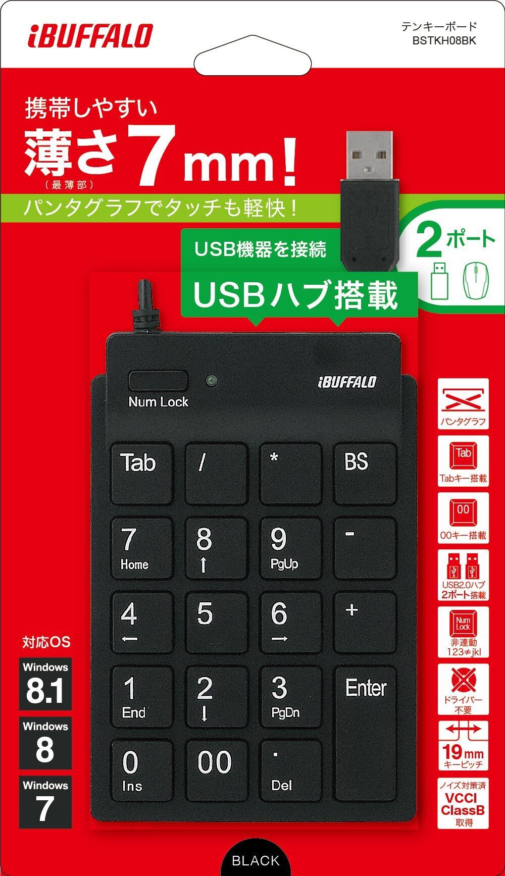 バッファロー BUFFALO 有線スリムテンキーボード ハブ付き ブラック BSTKH08BK