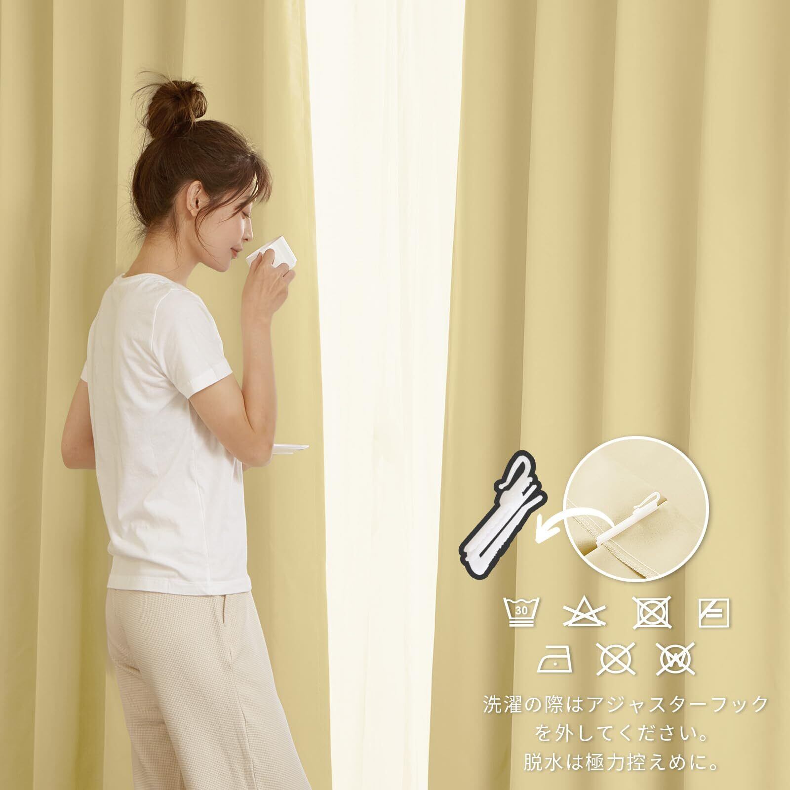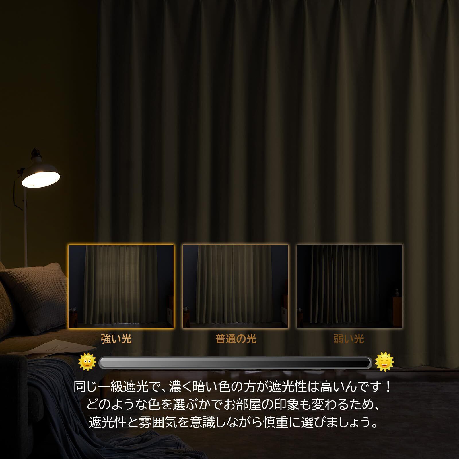 ◆【一級遮光】このカーテンは遮光度が99.99%以上,外からの光をほとんど通さないため、昼間カーテンを閉めたお部屋のなかで相手の顔の表情が分からない程度にまでお部屋を暗くできます。同じ等級であっても、カーテンの明度や色彩によって遮光の度合いが変わります。薄い淡い色は光を通しやすく、濃い暗い色は光を通しにくいです。遮光性を重視される方は濃色をおすすめします。