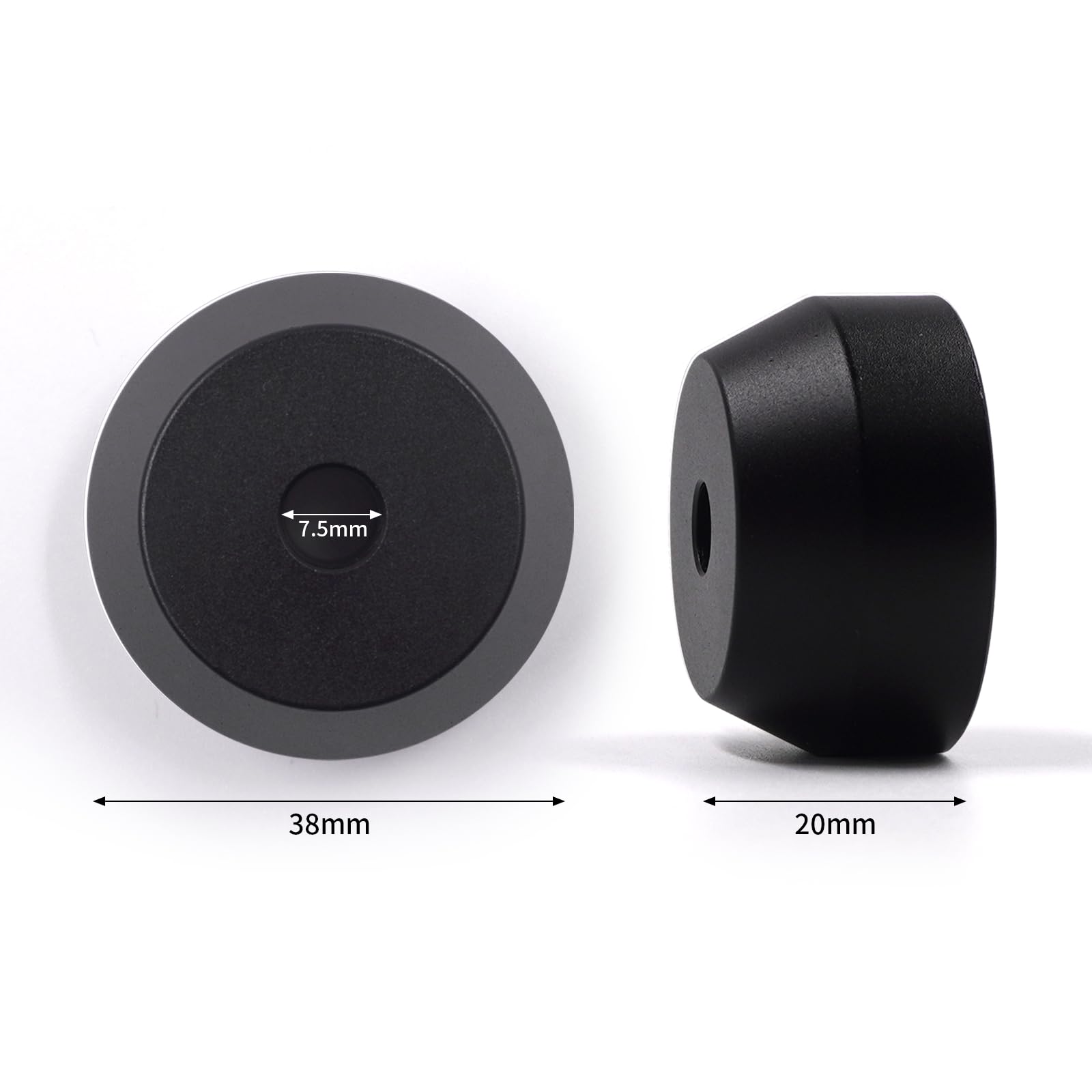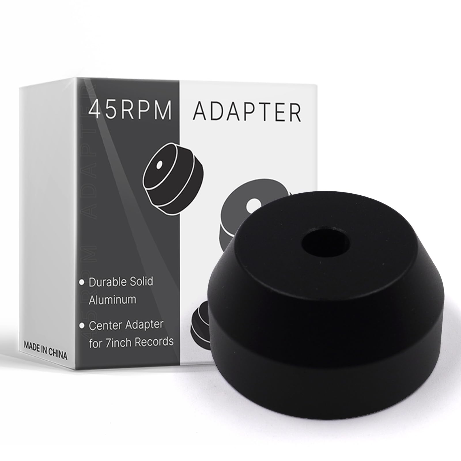 パッケージ内容:45回転 ソリッドアルミ製アダプター1個、重量51g、20mm(H)× 38mm(D)、中心穴7.5mm