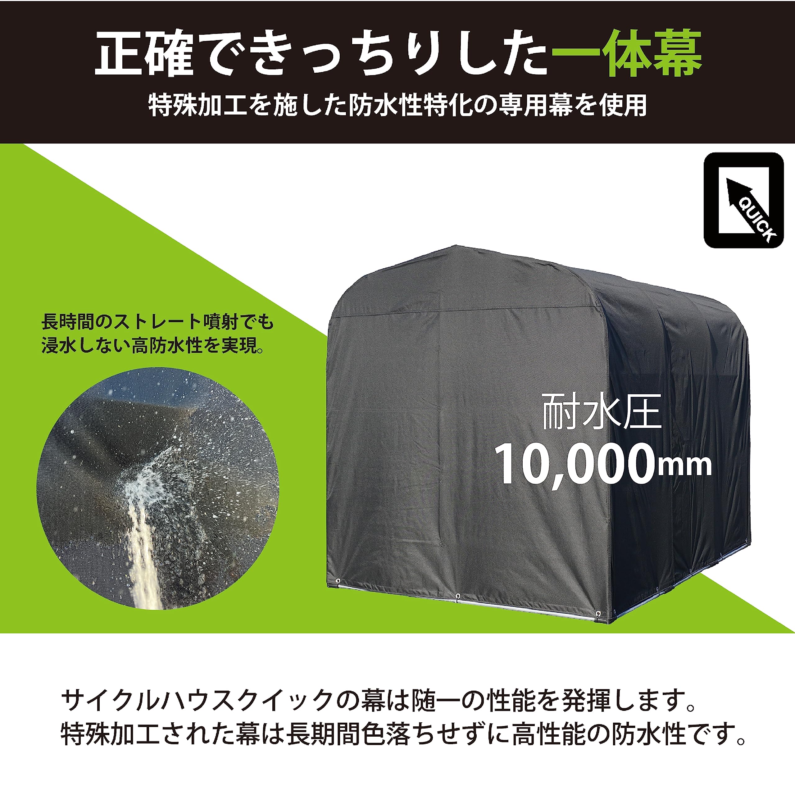 ・幕シートは、この商品専用の生地になり、他のサイクルハウスとは違う質感を感じられます。耐水圧は10,000mmあり、十分な防水性を発揮します。