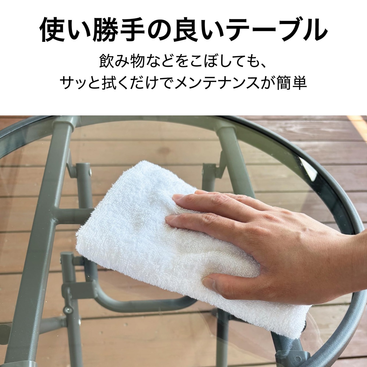 ガラス天板を使用したモダンなラウンドテーブル3点セット。どんな空間にもなじむシンプルなデザイン。テーブル天板はスモークガラスで落ち着いたシックな印象です。飲み物などをこぼしても、サッと拭くだけでメンテナンスが簡単。ストッパー付きで開いた状態をロックするので安定します。チェアーはファブリック生地を使用しているので体がフィットしやすく、通気性の良い生地で快適な座り心地です。脚先は床を傷つけいにくいプラスチッククッション付き。