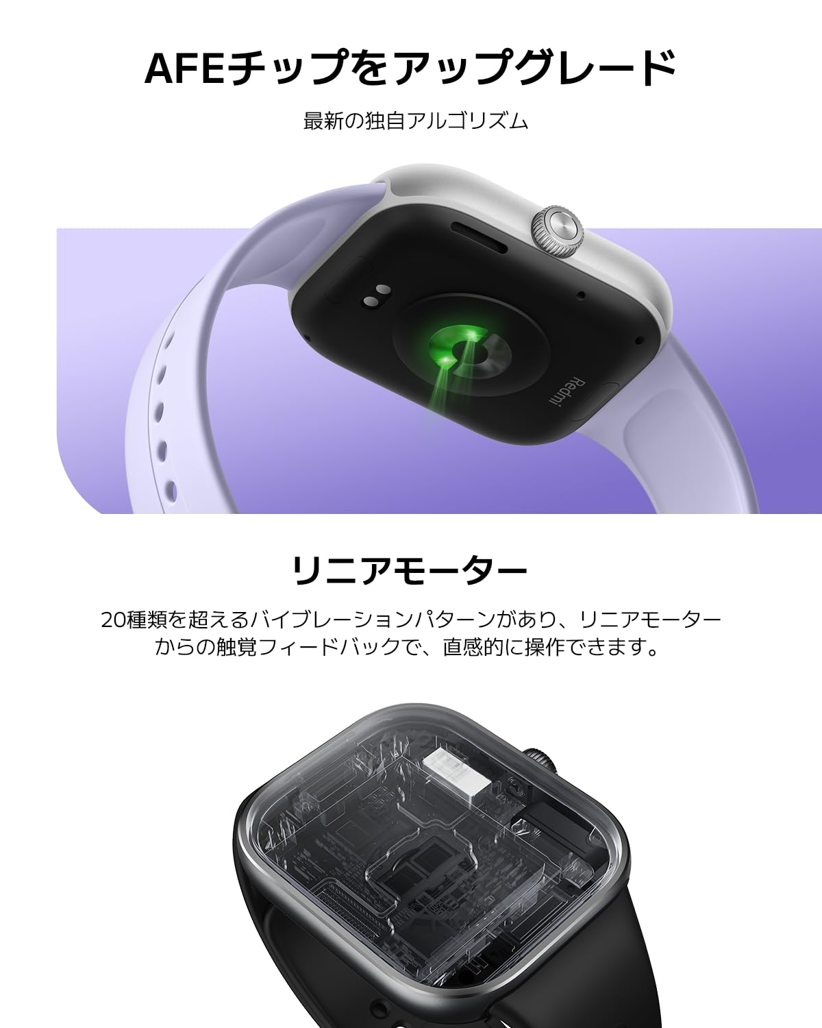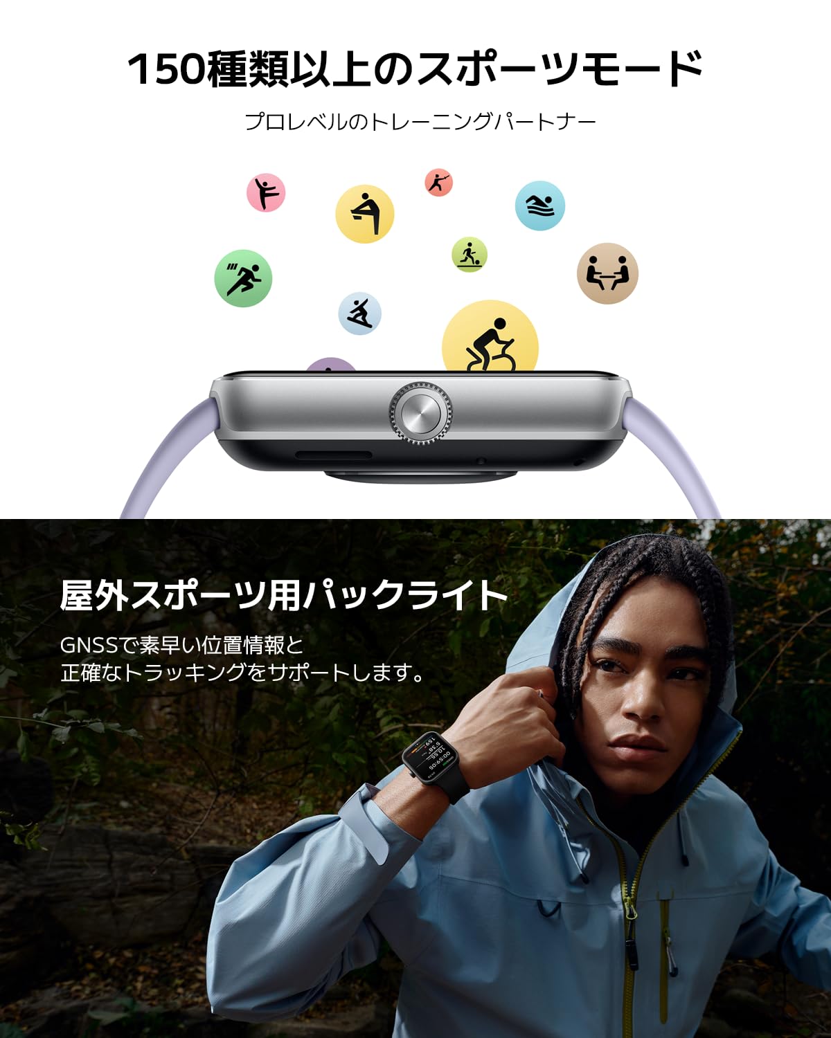 【心拍数と睡眠トラッキングの精度向上】新たに自社開発した心拍数アルゴリズムとAFEチップにより、心拍数モニタリング性能を5.2%向上。睡眠トラッキング性能も10%向上。さらに150以上のスポーツに対応し、あなたの運動をモニタリングします。いつでも包括的で正確なデータを取得し、ワークアウトを科学的かつ専門的に分析することができます。
