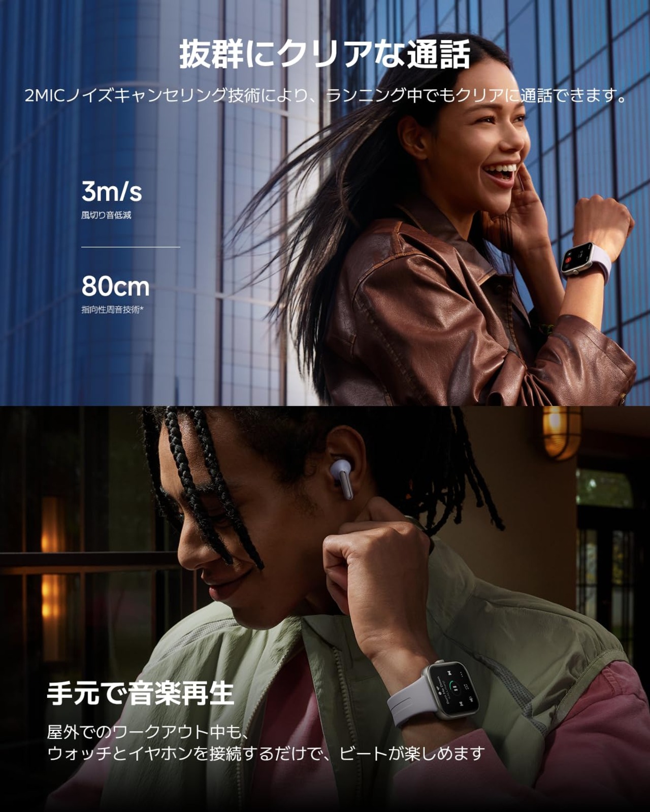 【アップデートしたデュアルマイクノイズリダクション】Bluetoothでお使いのスマートフォンと接続することにより、リモートワークや運動の最中も手元で通話することができます。さらに通話品質の向上のために2つのマイクを搭載し、3m/sの風切り音ノイズリダクションや最大80cmの集音にも対応しました。