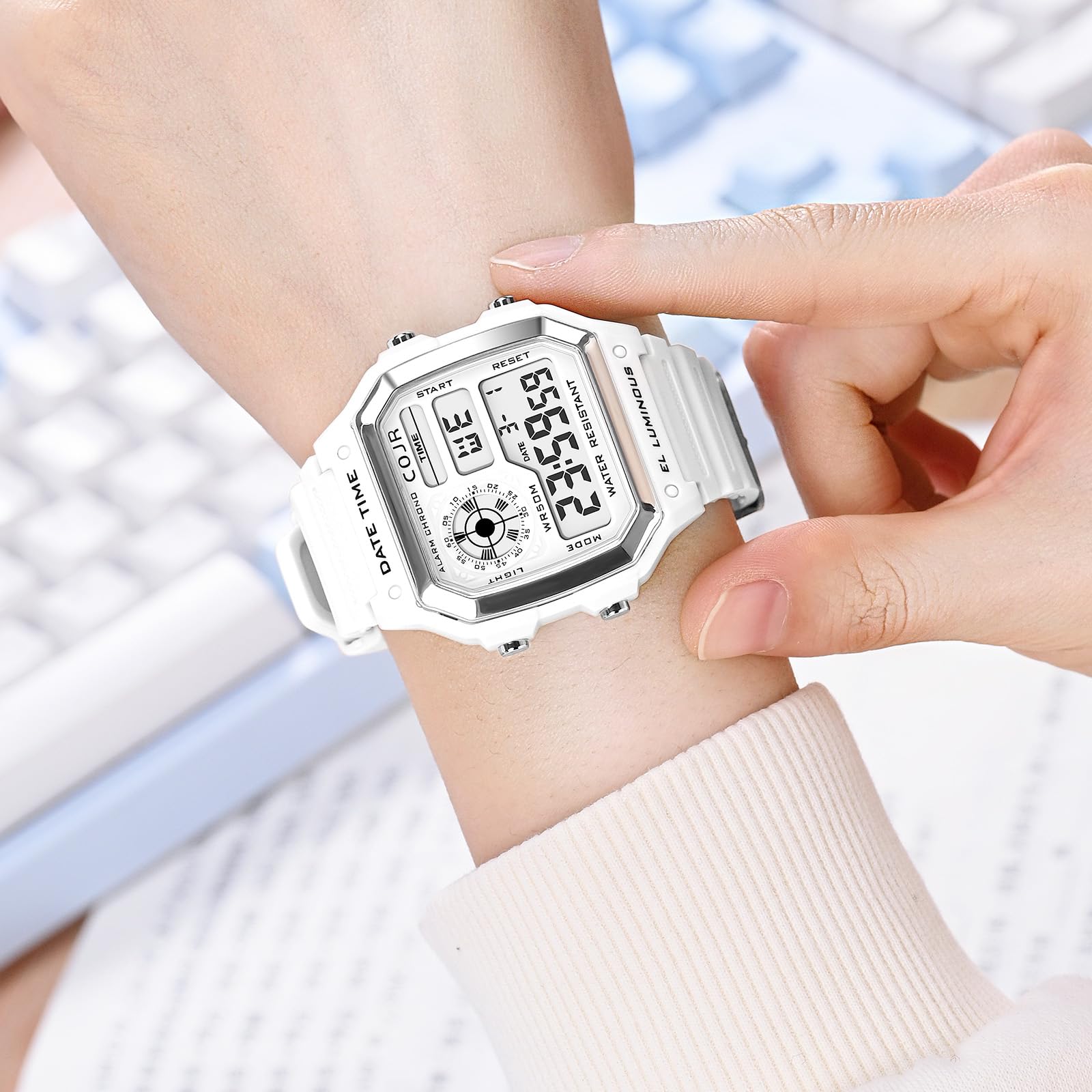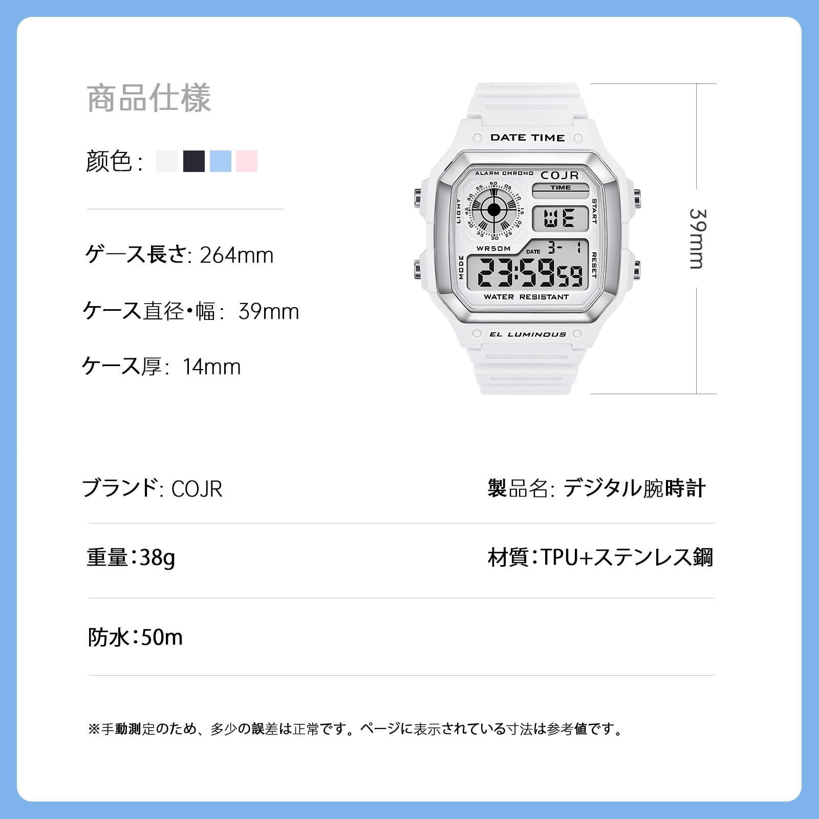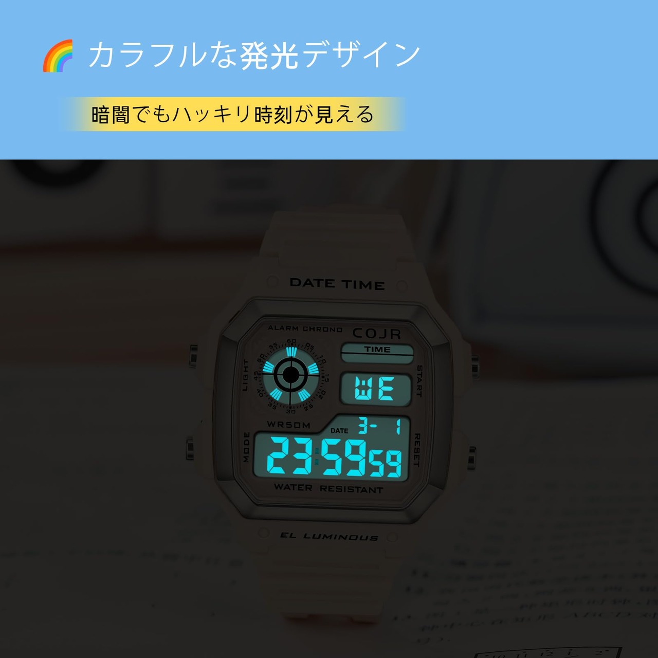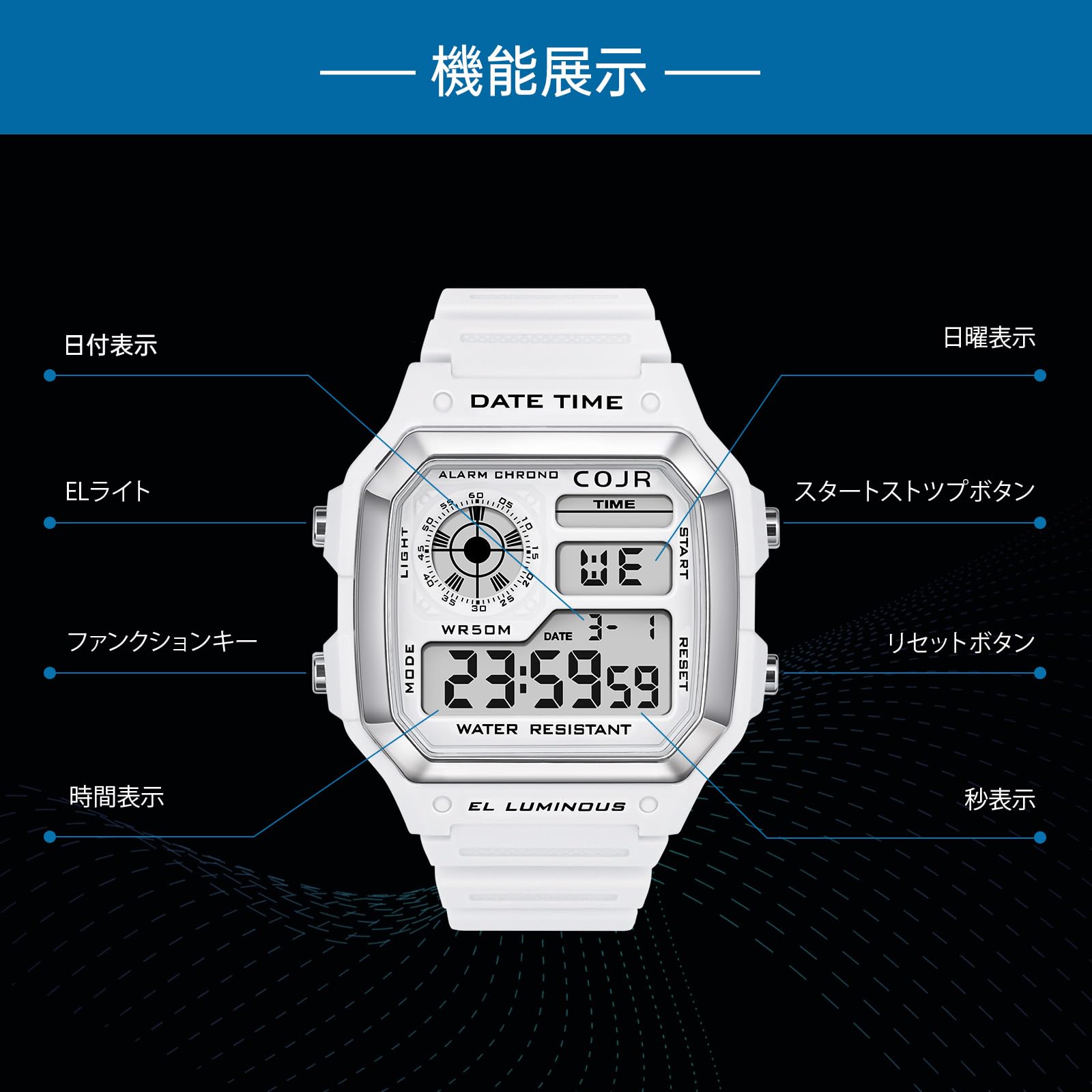 [COJR] デジタル腕時計 メンズ 5気圧 防水 腕時計 多機能付き アラーム ストップウォッチ 日付 曜日 LEDカラーライト 人気 ランニング シンプル アウトドア おしゃれ 男女兼用 日本語と英語取扱説明書付き (ホワイト)