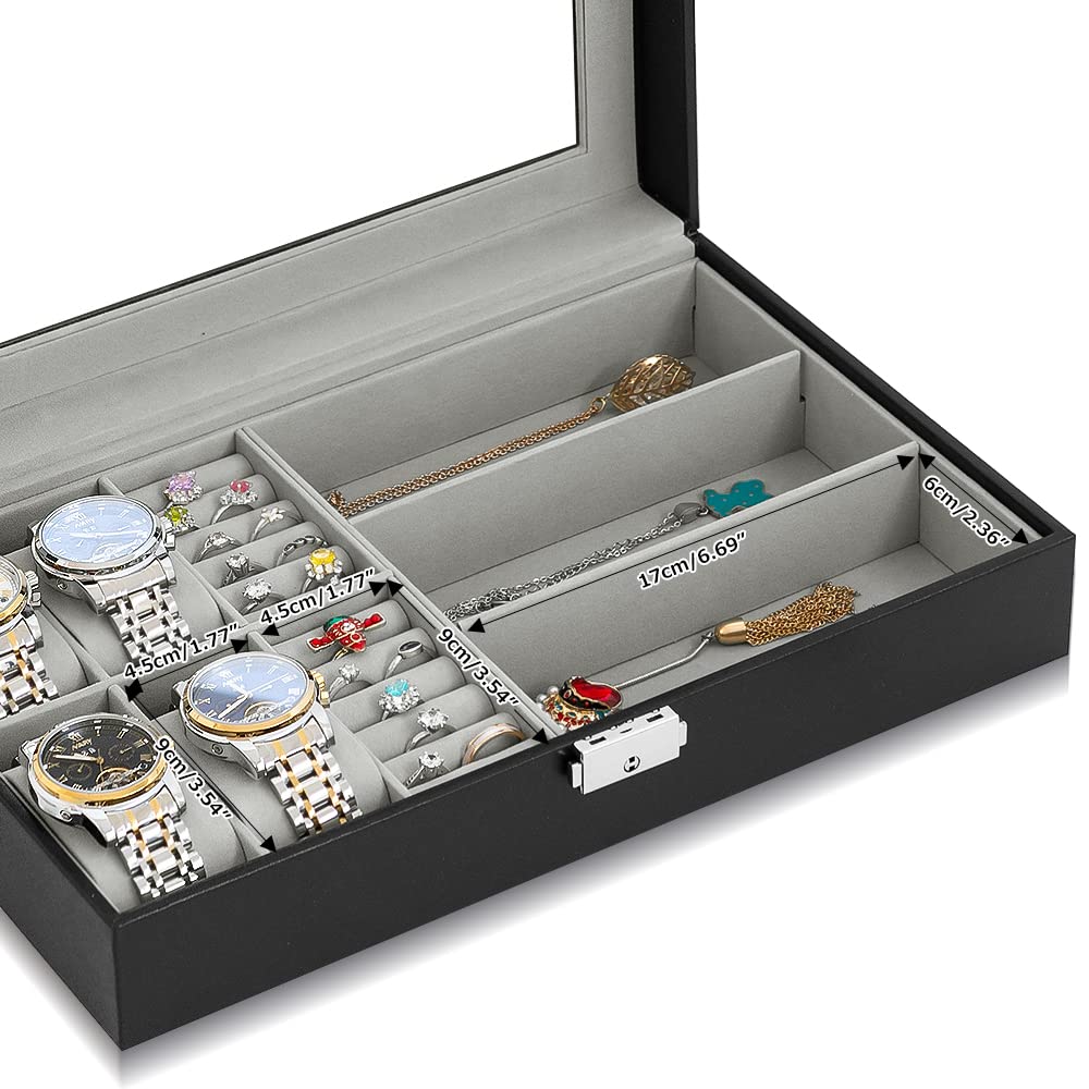 【在庫セール】Anyasun 腕時計ケース 3本 6本 腕時計収納ボックス 高級 時計 コレクションケース カーボンファイバー仕上げ 男女兼用 インタリア用 レザー製クッション 鍵付き (G:1段式・4+3)