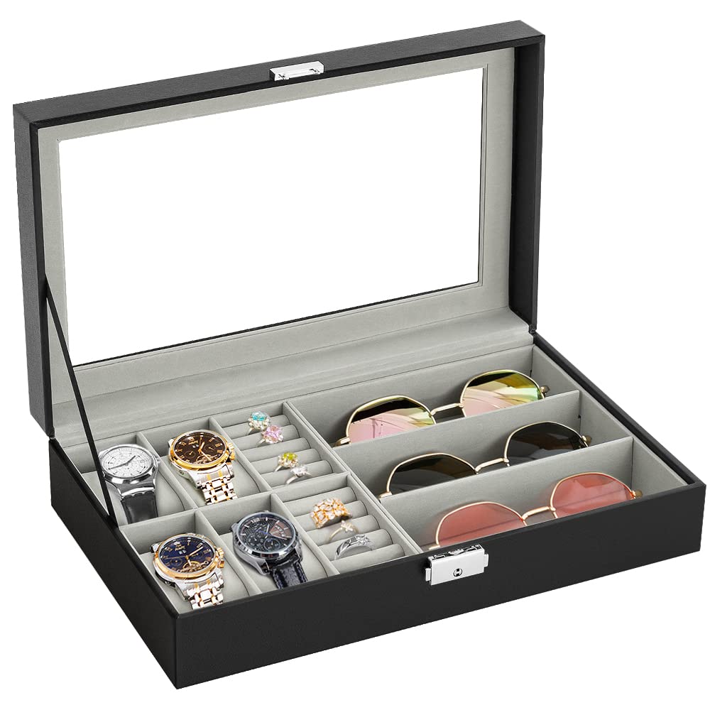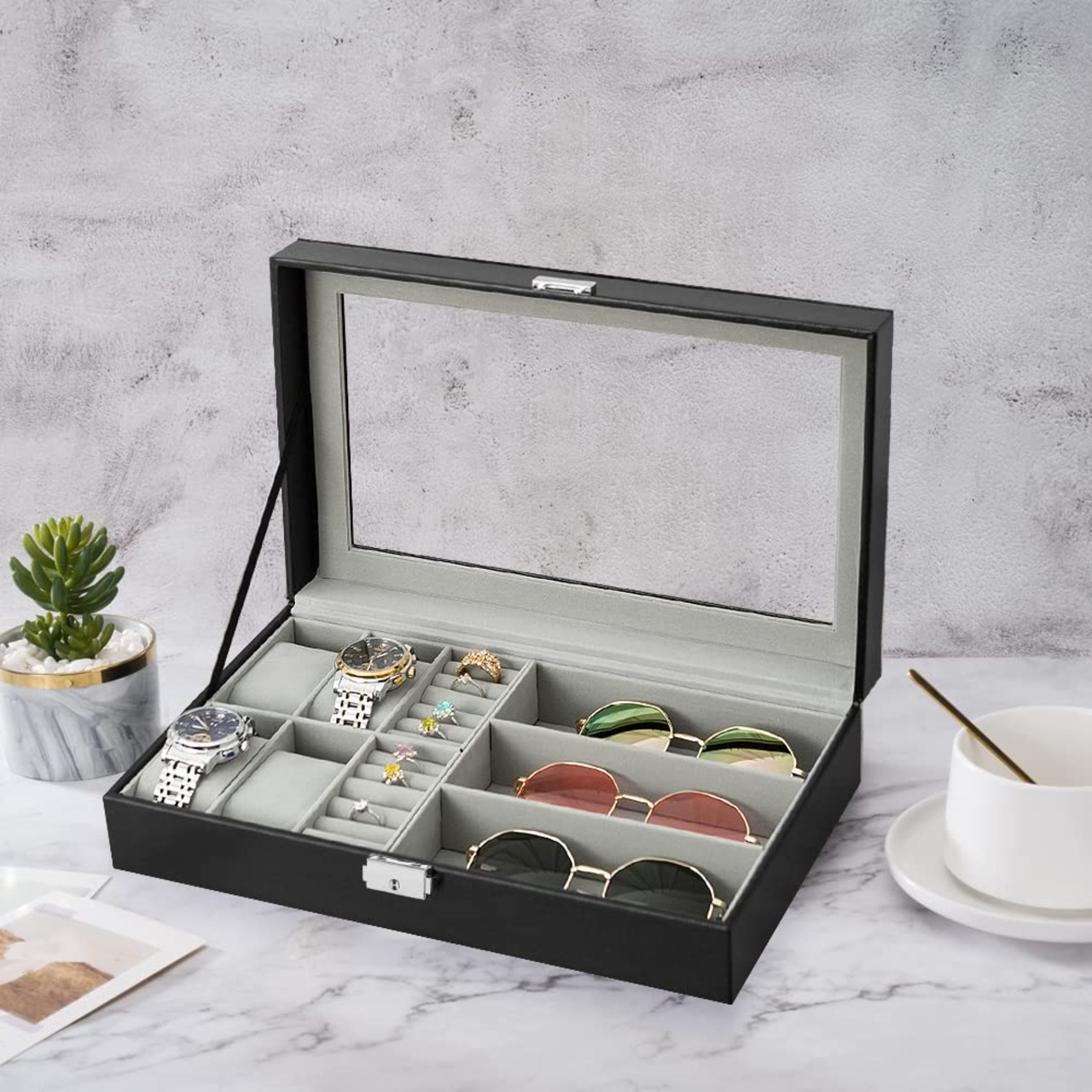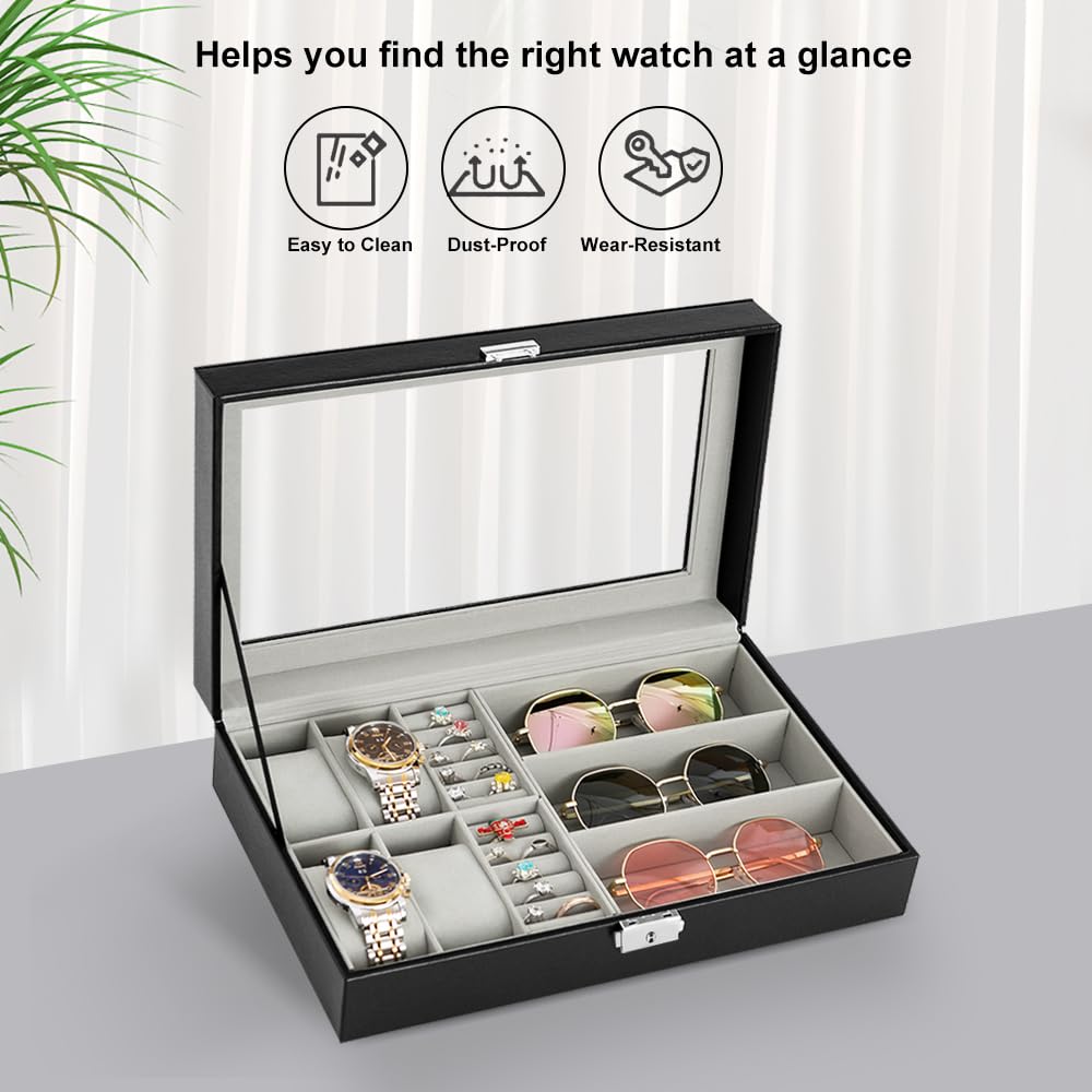【時計4本+メガネ3本収納可能】大切な時計を4本、メガネ、サングラスと時計バンド3本と一緒に収納できるウォッチケースです。 幅4.5cmのクッションは男女ともに使える、細めの時計から大きな文字盤まで腕時計。