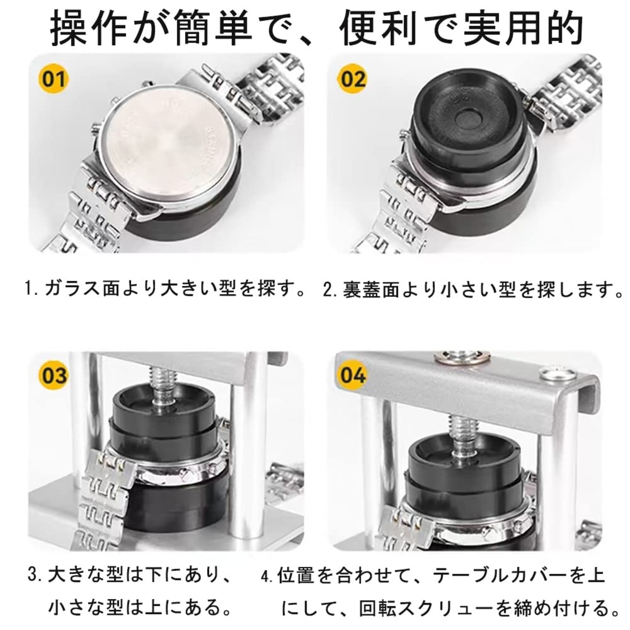 3.【簡単な操作】:腕時計メンテナンスの必需品 裏蓋閉め機でございます。修理や電池交換の際、裏蓋を自分で簡単に開ける、閉じるため工具セットです。使用:1合わせるサイズを選択します。2本体に接続します。 3上と下両方を固定します。 4本体を捻って蓋が締めます。