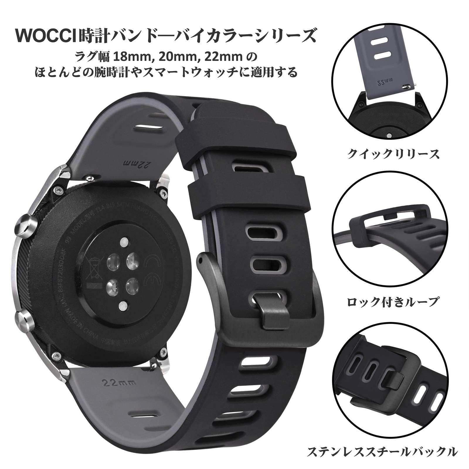 [WOCCI]時計ベルト 18mm 19mm 20mm 21mm 22mm シリコンラバー腕時計バンド Quick Release バイカラー ゴム替えベルト