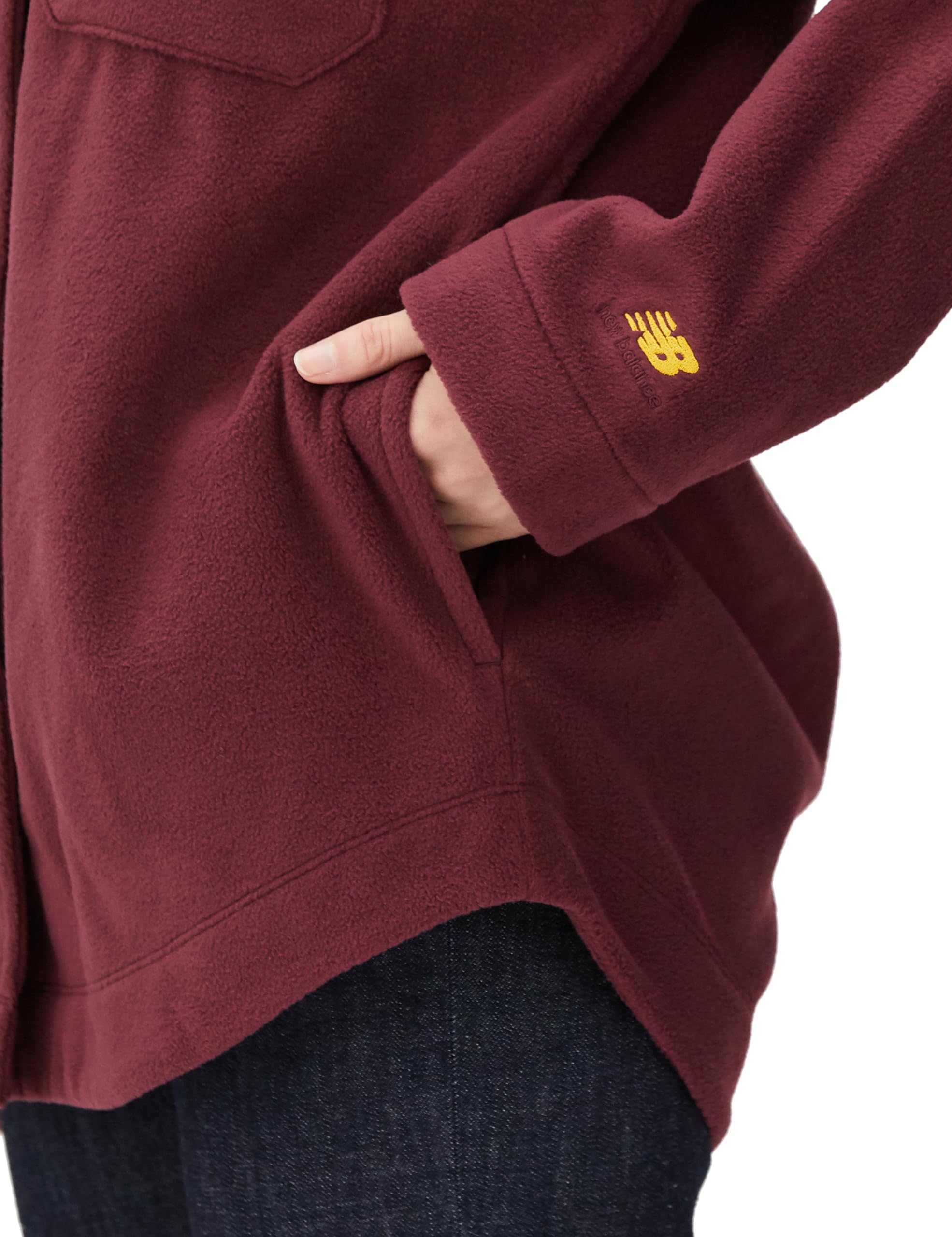 90年代のワークウエアから着想したウィメンズウエア“シャケット”。なめらかな肌触りと冬も快適な保温性を発揮する厚手のポリエステル/レーヨンフリース素材を使い、カジュアルにもキレイめにも着こなせるオーバーサイズフィットで展開します。デザインアクセントになる胸の大きなポケットに加え、ハンドポケットも備えています。NB Athletics スウェットパンツとのセットアップもおすすめです。