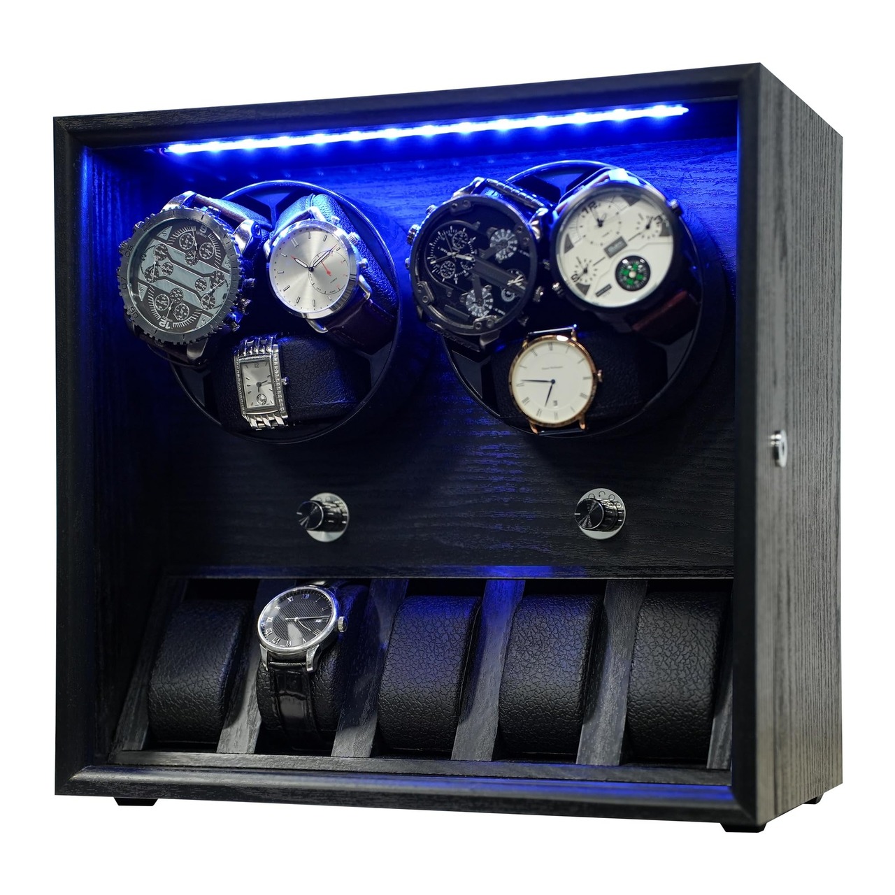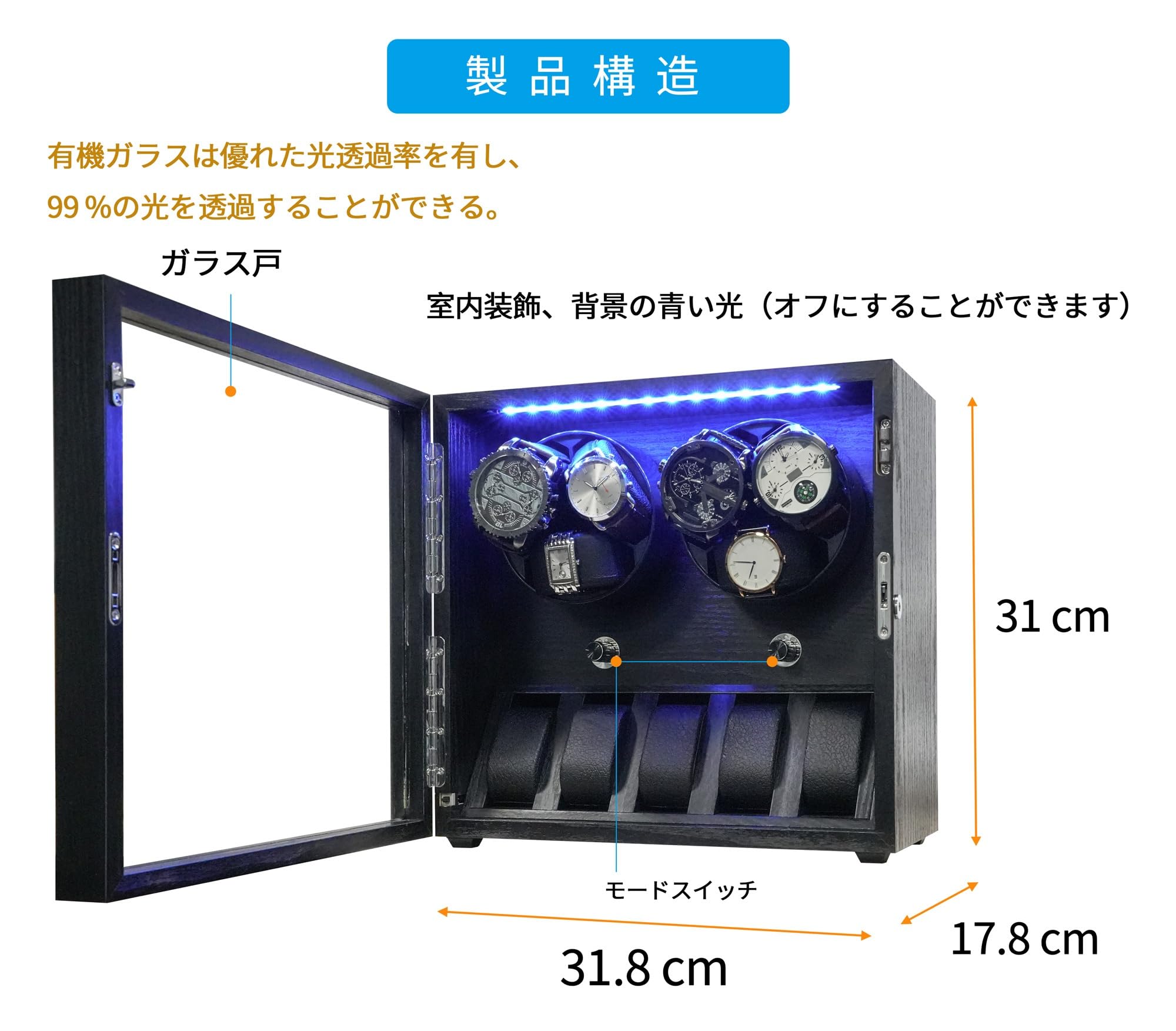 ハイエンドの人気デザイン : 静音設計、防磁設計、動作音が非常に静かなので、寝室や書斎に置くこともおすすめします。6本同時に回転することができ、5本の時計を追加収納することができます。内蔵のLED青い光照明、暗くでも素早く正確に腕時計を入手できます、落ち着いた雰囲気を醸し出します。インターロック機能付き、扉を開いた際ホルダーの回転を自動停止。