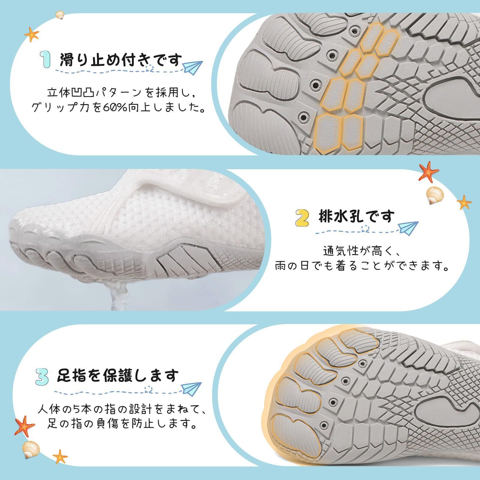 耐久&滑り止め:立体滑り止め底+排水穴設計で、濡れた路面でもグリップ力60%向上。ハニカム構造のクッションインソールが衝撃を吸収,転倒防止に貢献します。