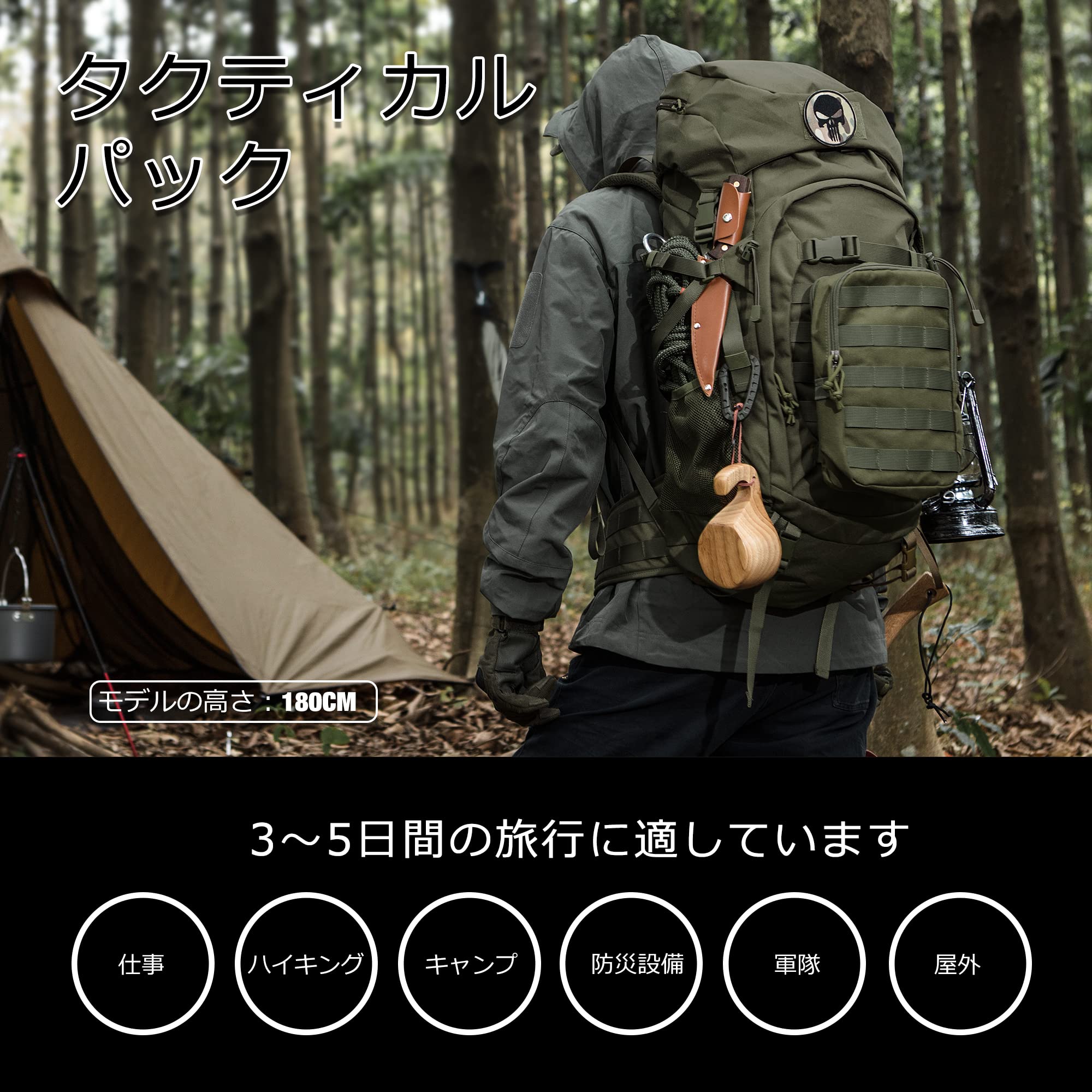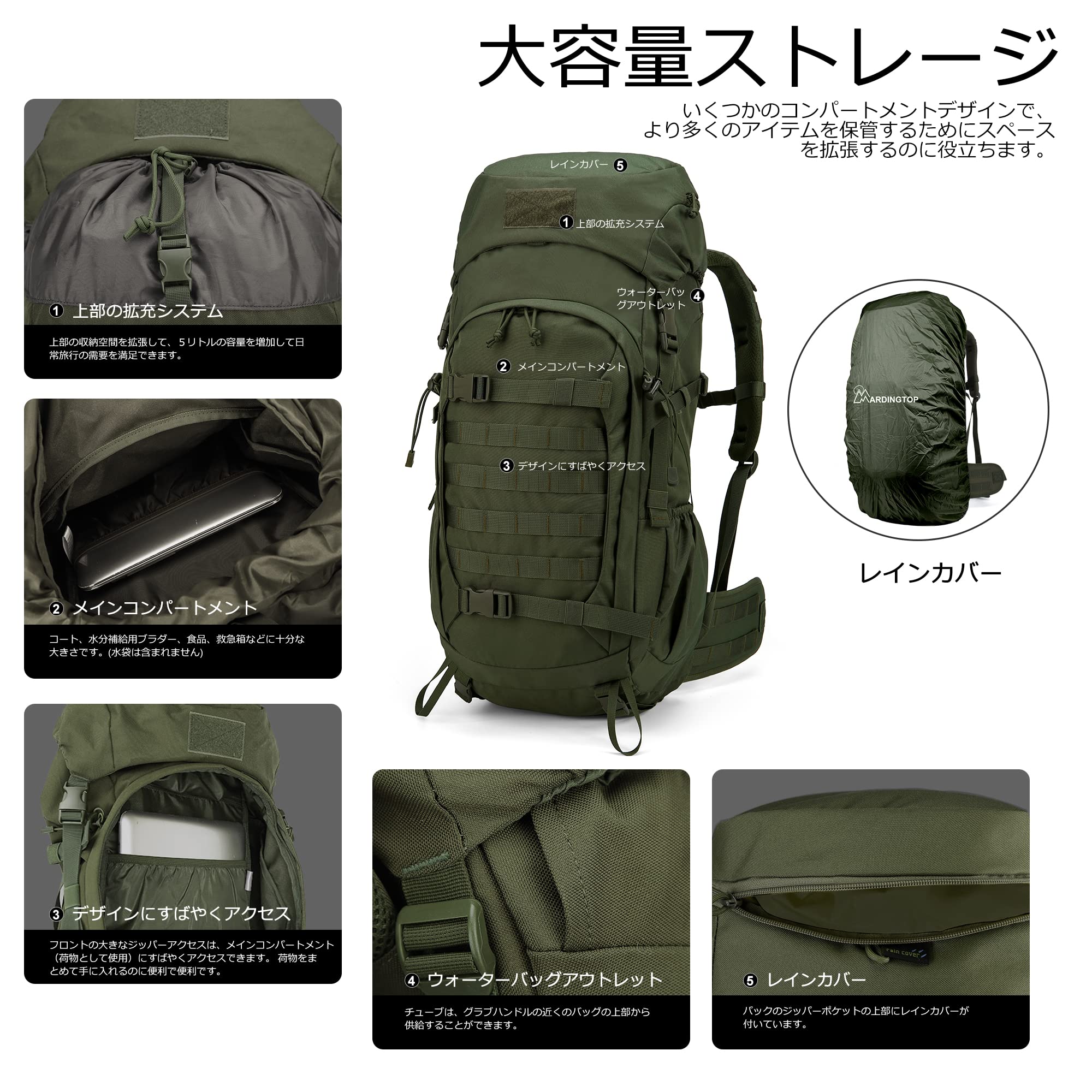 [Mardingtop] 50L バックパック 大容量 登山 リュック タクティカル パック ミリタリー リュックサック 軍用 キャンプ トレッキング 旅行 防災 レインカバー付き