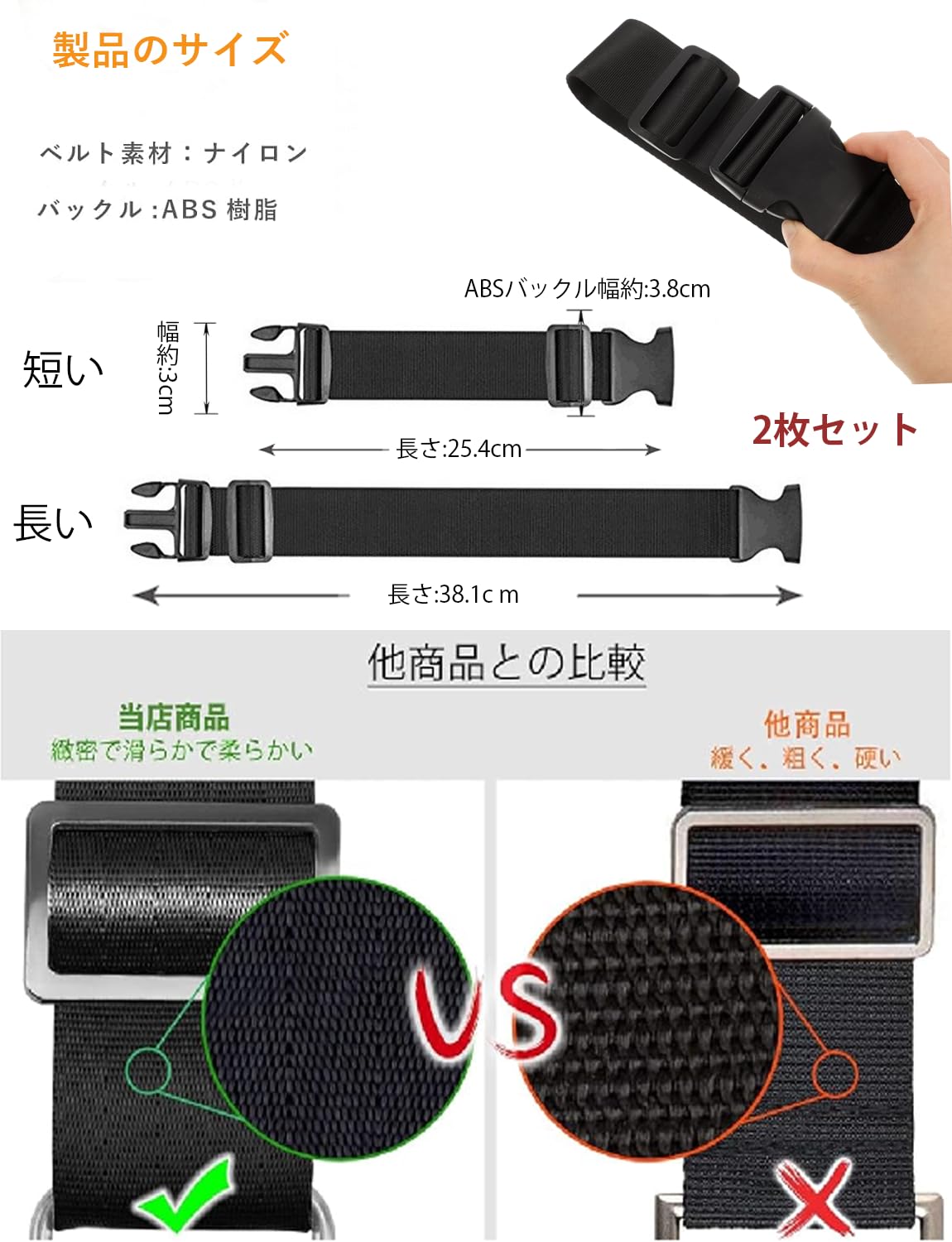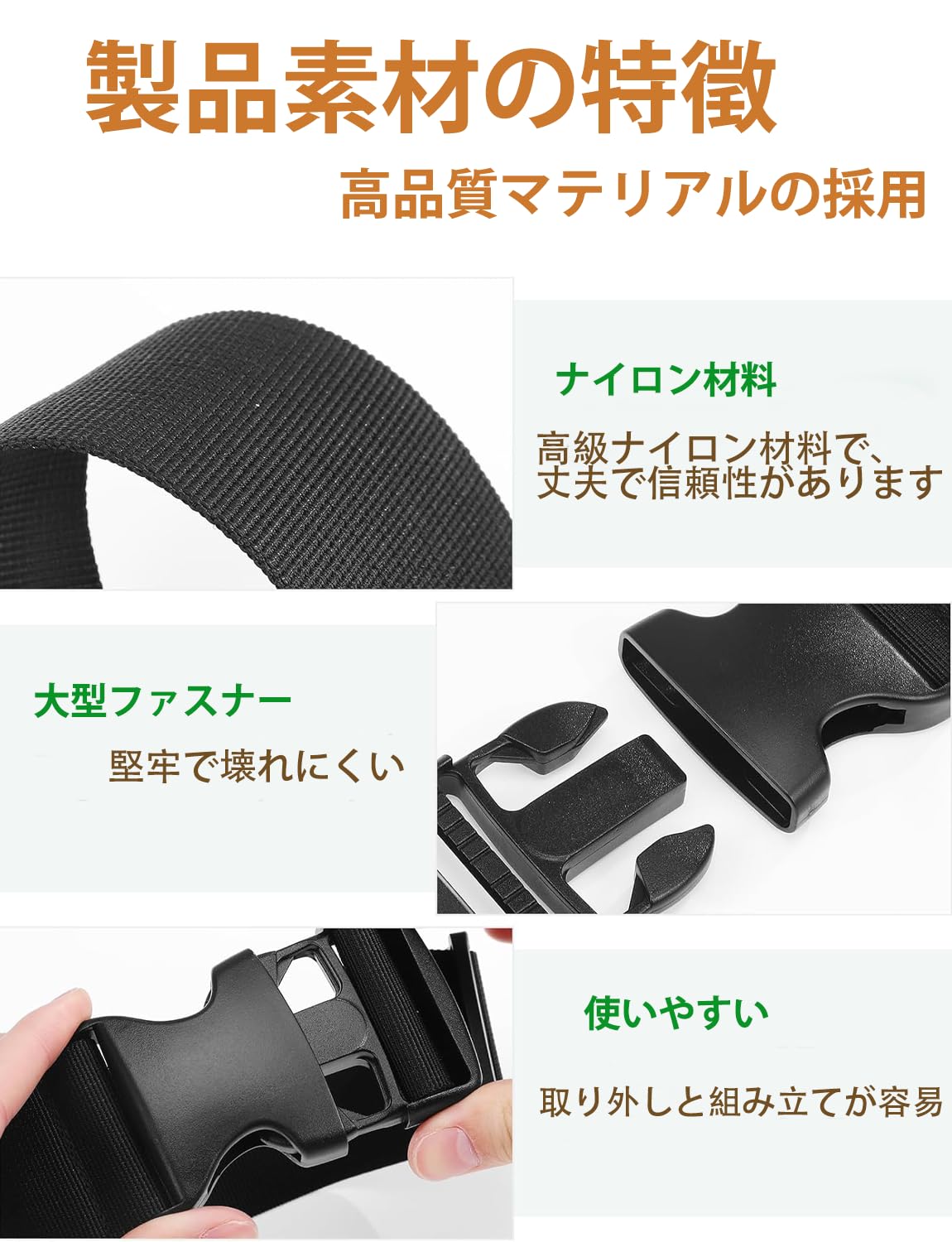 【製品仕様】:ナイロンベルトと高品質プラスチックボタン-取り付けと取り外しが容易。金具などがなく、バッグや荷物を傷つけることもありません。