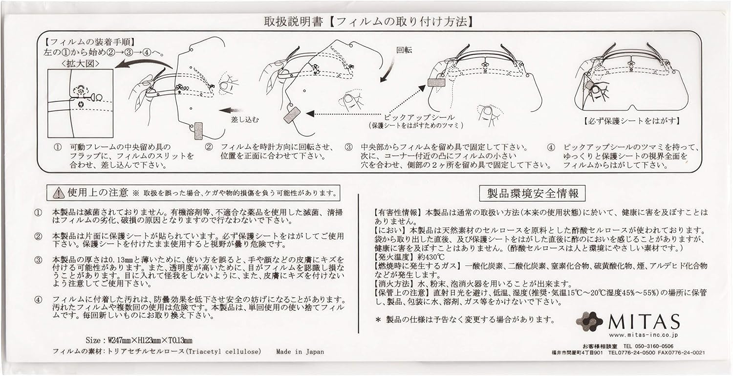 ●規格:ハーフフェイス●入数:10枚●サイズ:W247×H123㎜●フィルムの着脱が簡単な使い捨てタイプ。●めがねとの併用が可能で、フィルムを上にはねあげることができます。