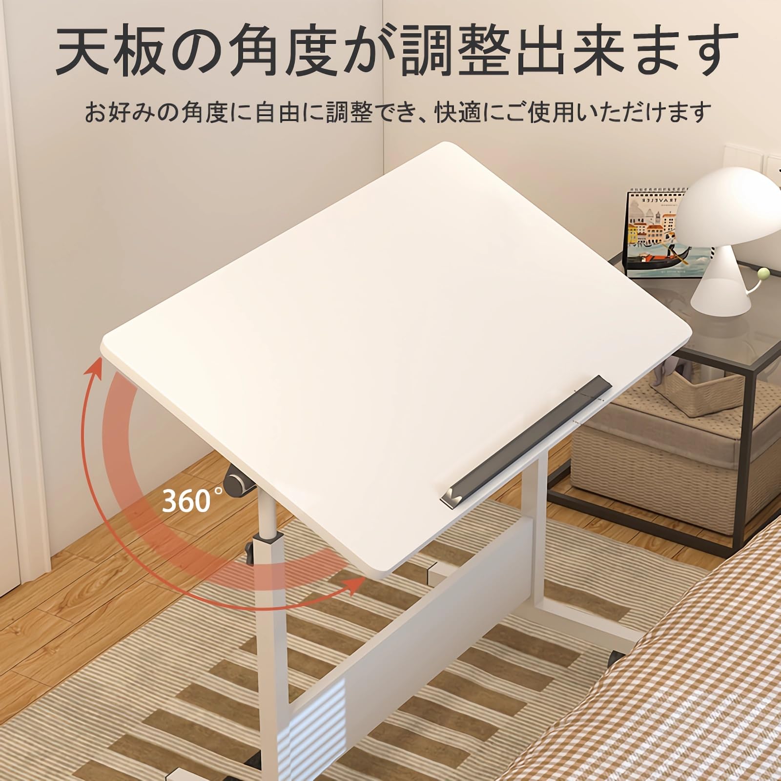天板角度調整可能:360°幅広い傾く範囲無段階調整可能、使いやすい角度でお使いいただけます。天板を傾けた時にノートパソコンやタブレット、雑誌などが落ちないようにストッパーが付いています。使用しない時は天板を折り畳みむことで圧迫感がなく収納しておけます。