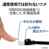 ツメ折れ防止プロテクターと屈曲に対する耐久性が高い素材のコネクターを採用したダブル構造で、ツメが折れにくいLANケーブルです。 ※1000回の屈曲検査に合格(当社検証)