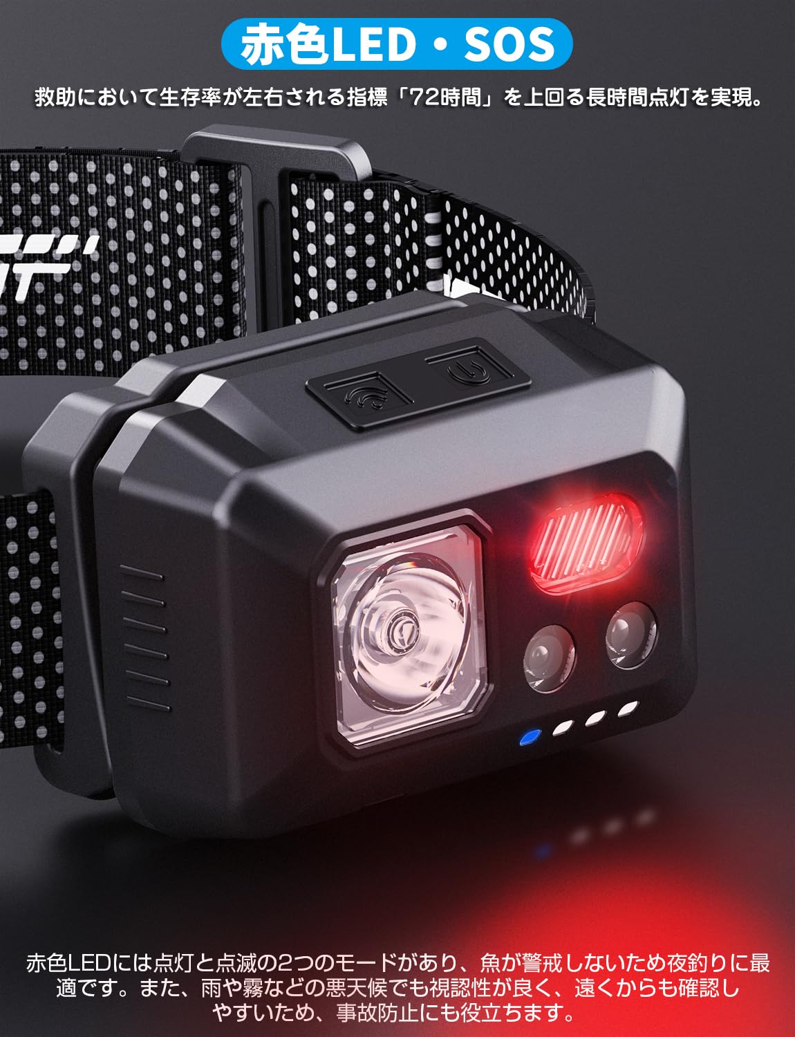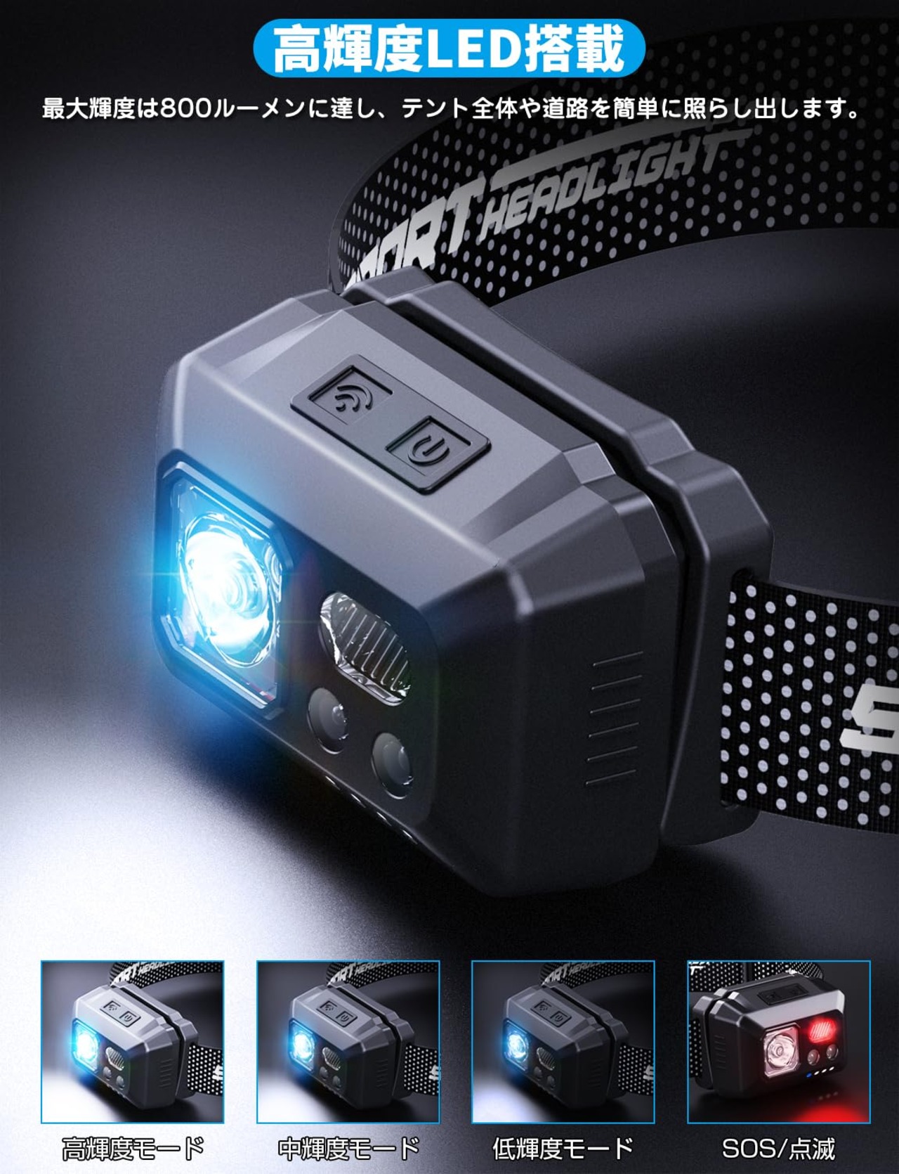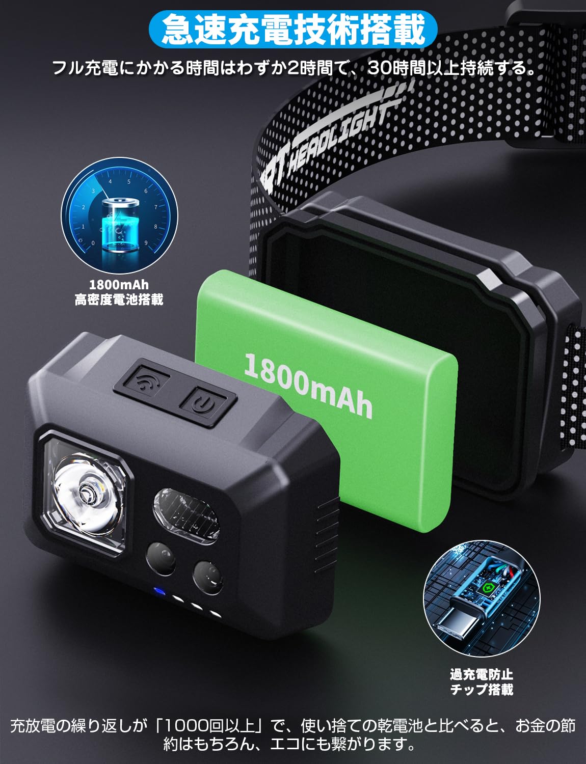Tebool ヘッドライト Type-C充電式 大容量1800mAh 高輝度 LED 1000ルーメン 手振りセンサー機能付き 5種点灯モード 赤&白ライト SOS点滅 頭につけ ヘッドランプ 防水防塵 60°角度調整可 夜釣り 最適 登山 キャンプ 散歩 作業 釣り アウトドア 災害 停電用 小型 超軽量 ヘッド ライト