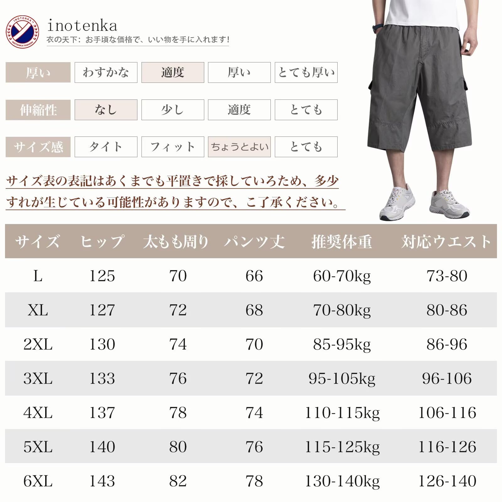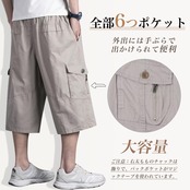 [inotenka] カーゴパンツ メンズ ハーフパンツ ショートパンツ L-6XL 大きいサイズ 6つポケット 七分丈 無地 ゆったり ビッグシルエット 半ズボン 作業着 調整紐 アウトドア ワイドタイプ カジュアル 通気 春夏