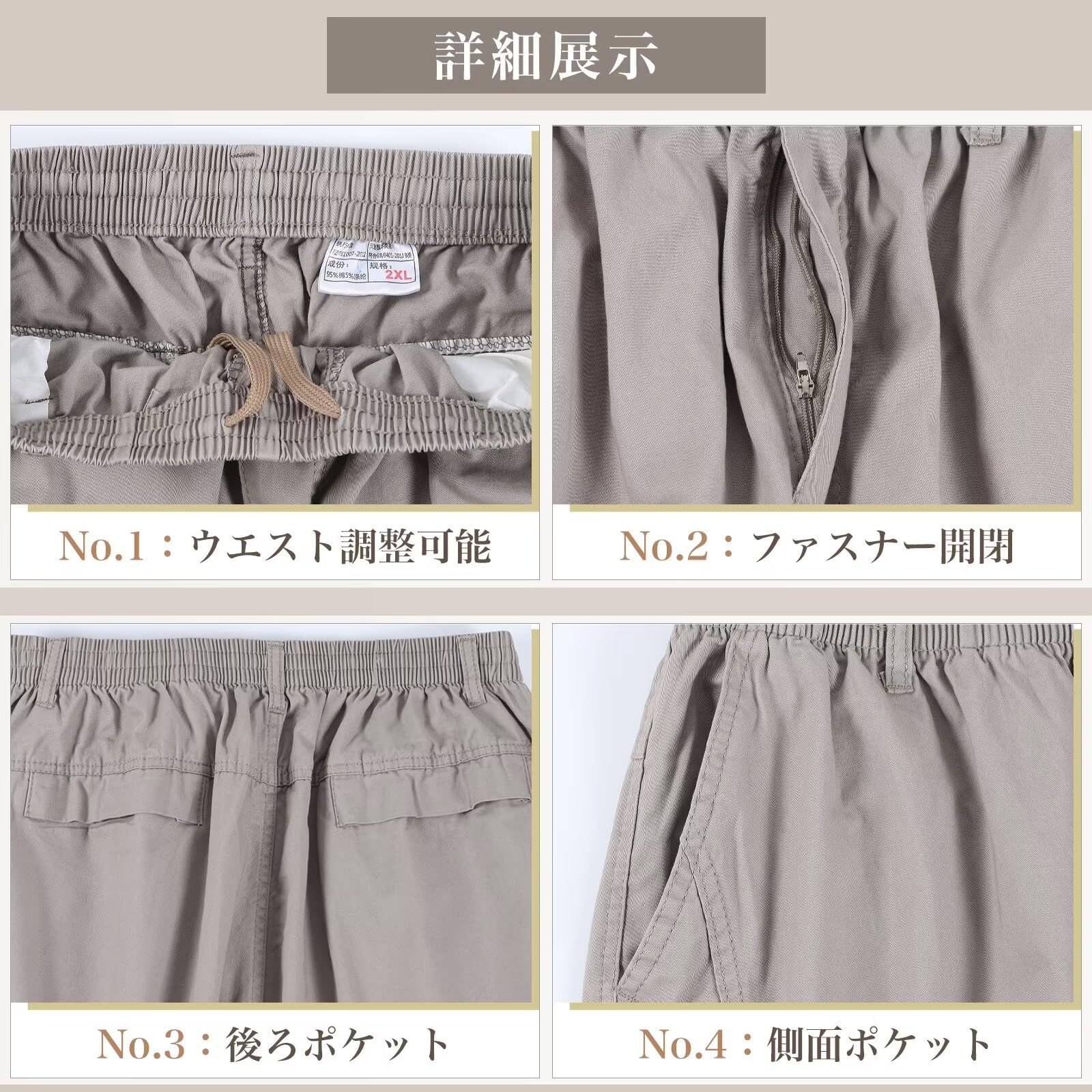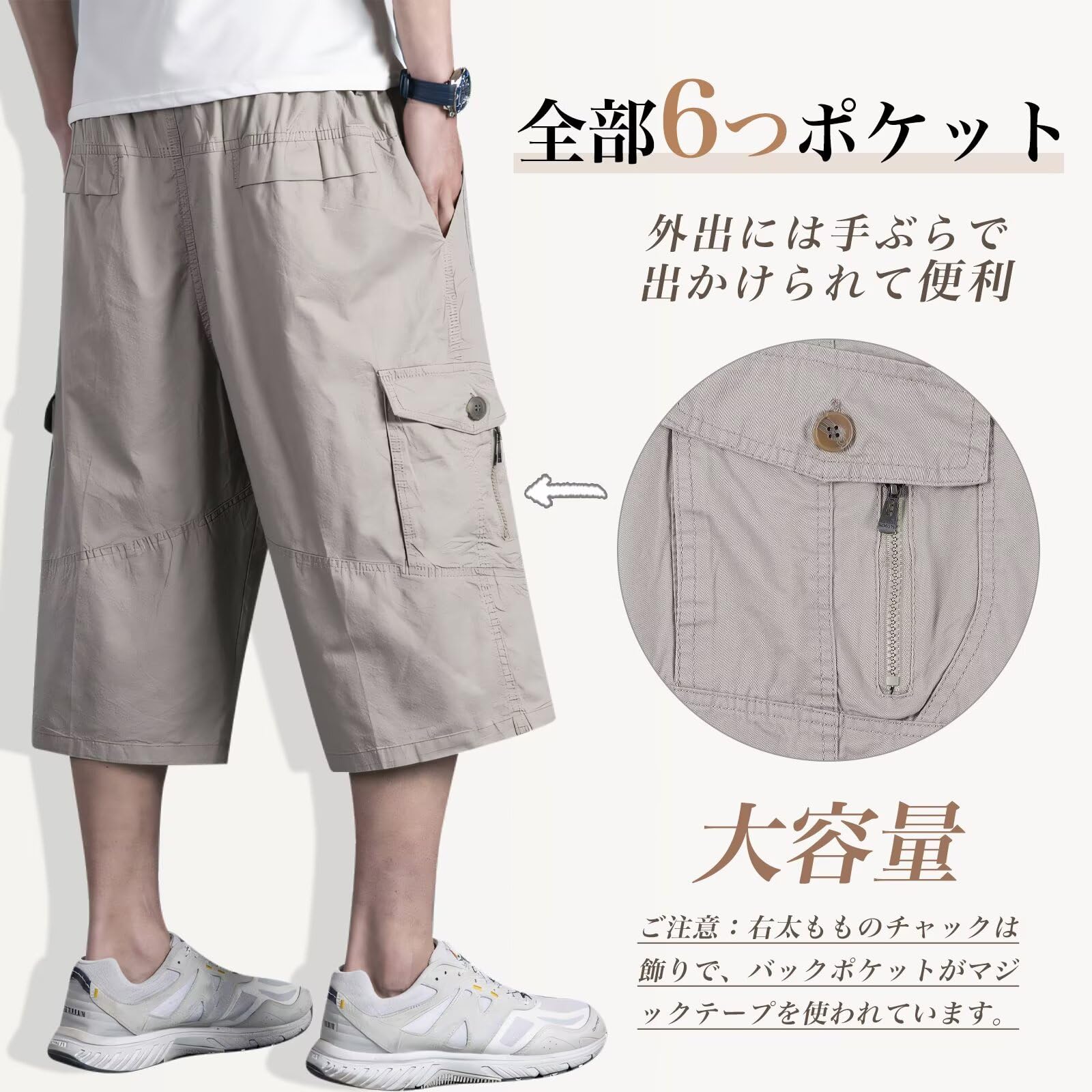 [6つポケット付き」カーゴパンツは6つポケットがあり、鍵や携帯などの小物が収納出来ます。 ちょっとした外出には手ぶらで出かけられて便利です。両脚側面のポケットにはファスナー付きで、おしゃれ、実用性と便利性を備えた大きいサイズハーフパンツです。(ご注意:2016.ver右太もものチャックは飾りで、バックポケットがマジックテープを使われています。)