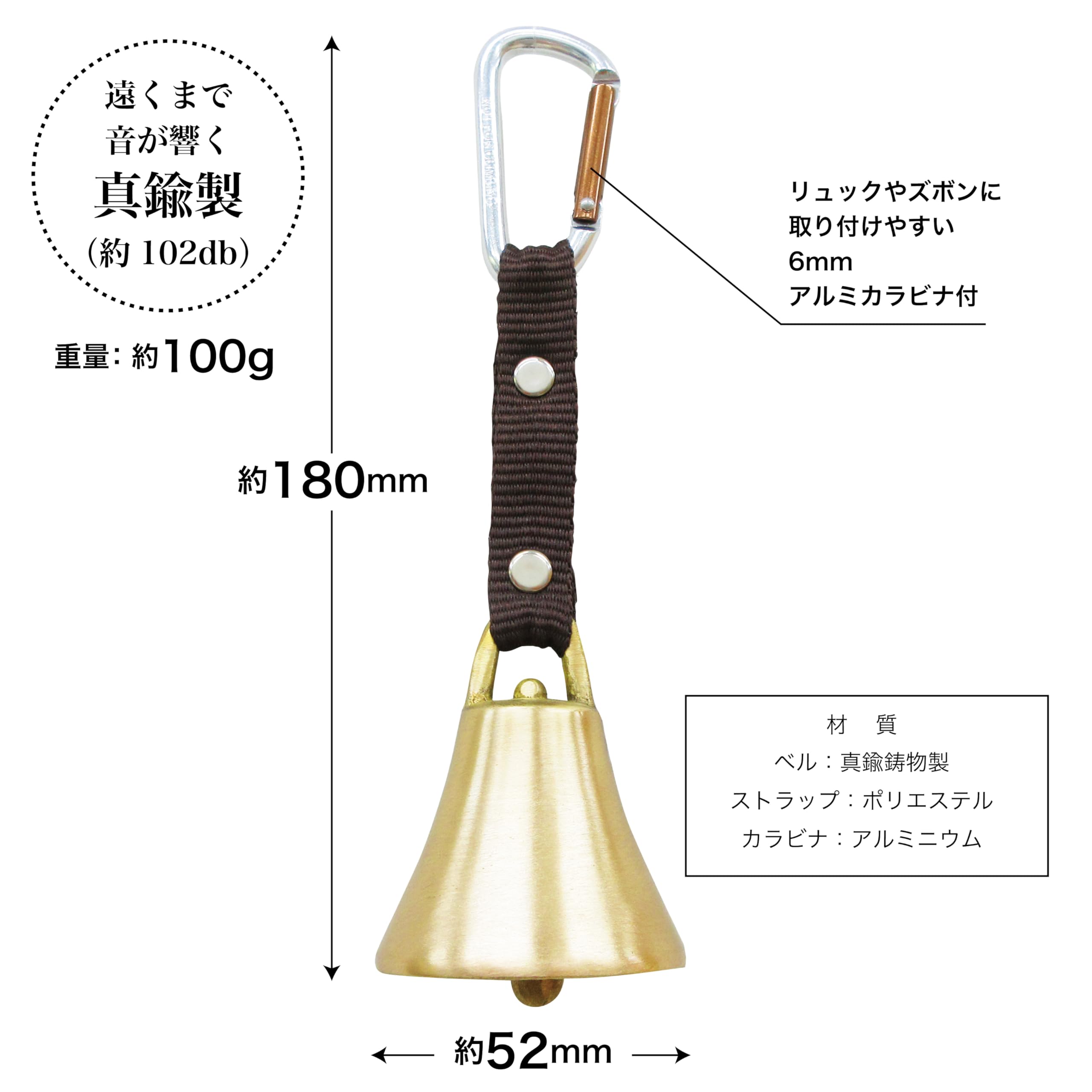 材質:ベル/真鍮鋳物、カラビナ/アルミニウム
