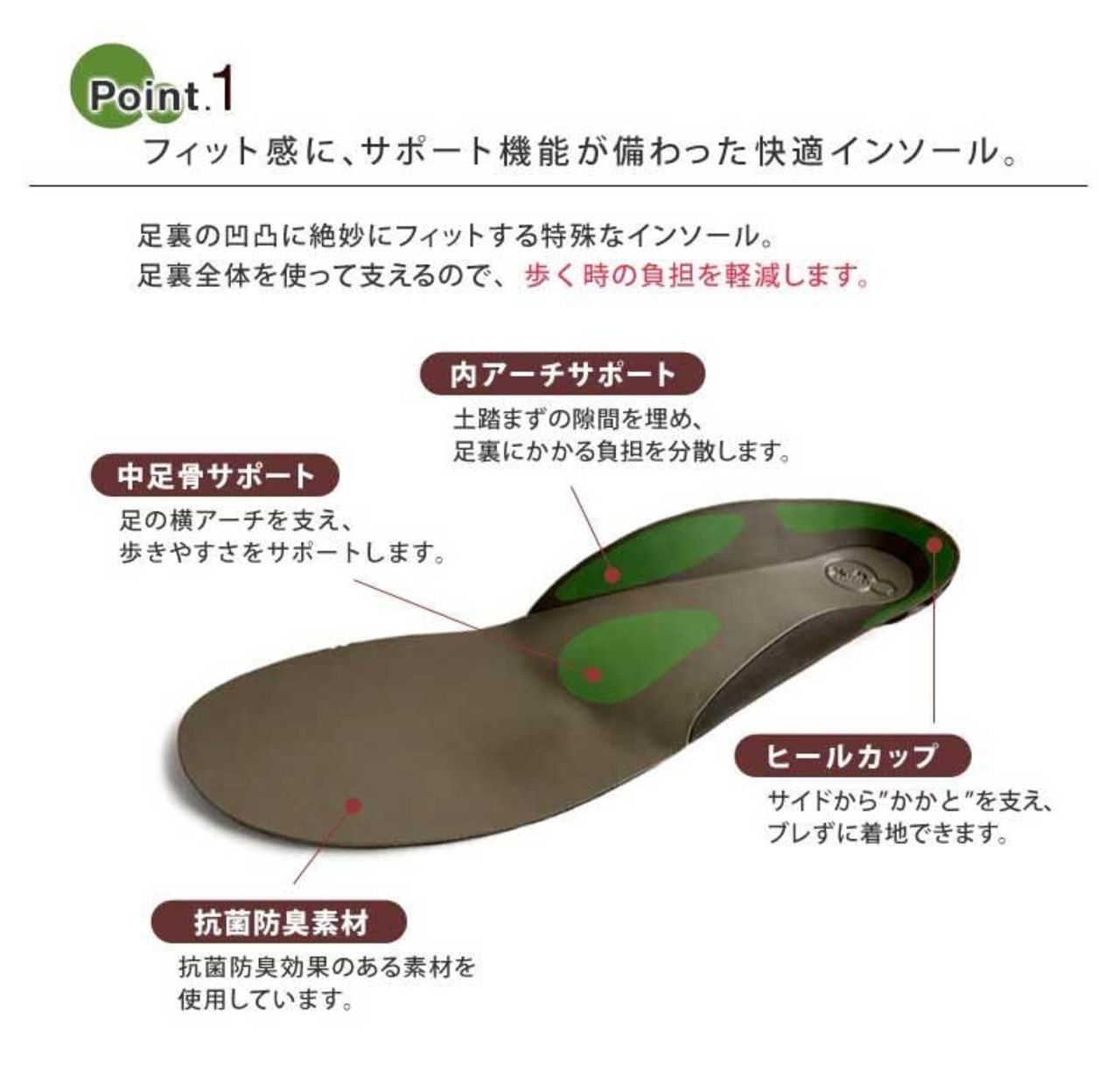 毎日の生活の中で生じる余計な体力ロスを軽減してくれる独自形状の“つかれどめインソール”を採用
