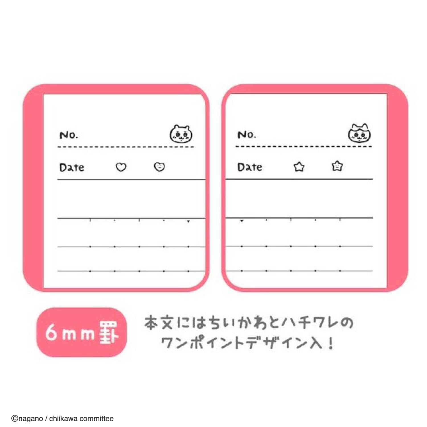 色や柄が一冊ごとに異なるので、教科ごとなど使い分けても一目で分かります。日付欄のワンポイントがさりげなく可愛い、シンプルな本文デザインです。漫画から抜粋したストーリー仕立てが楽しい[ちいかわ]柄。