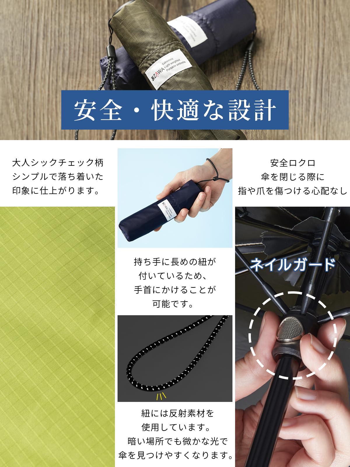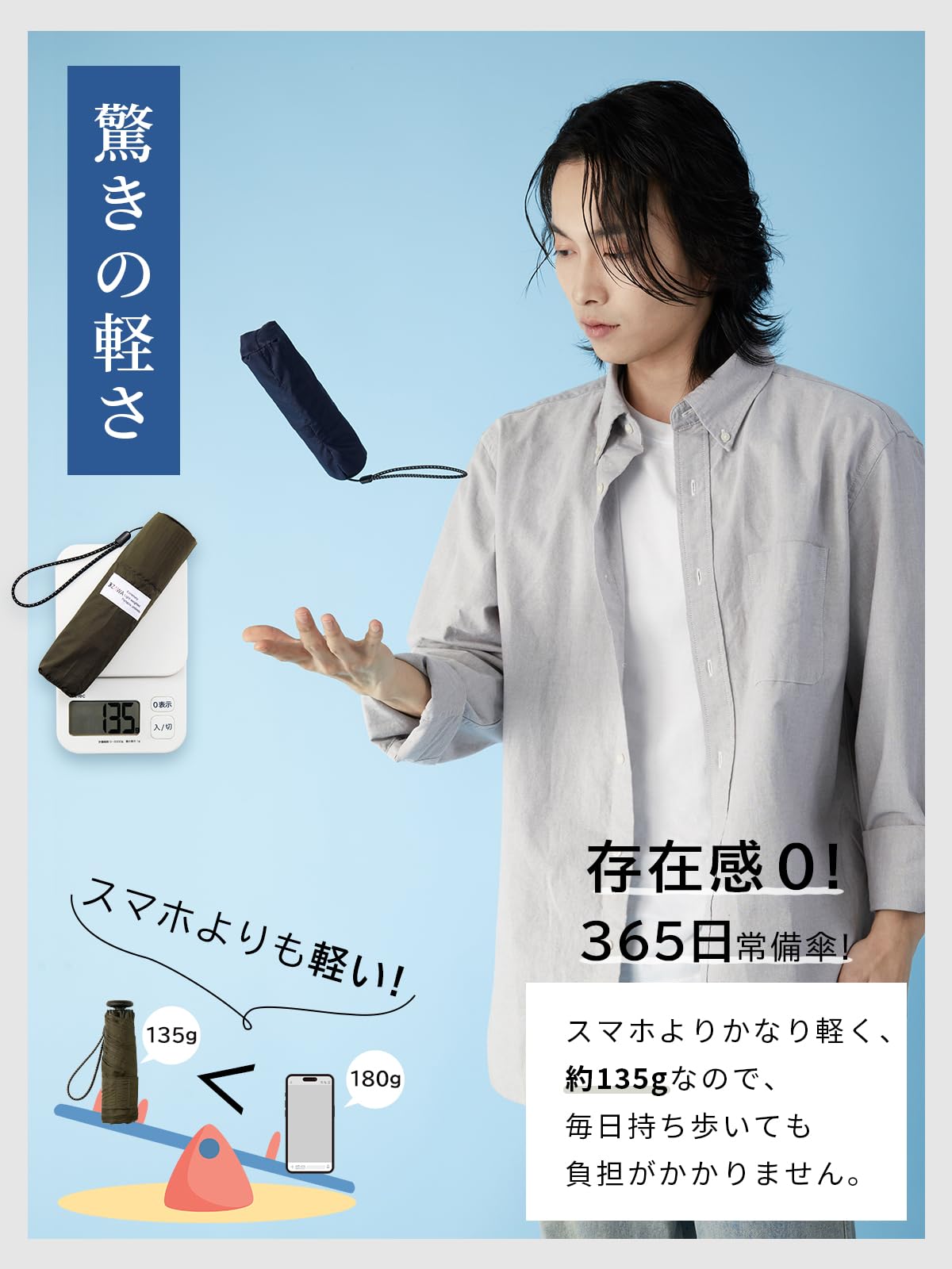 【スマホより軽い135g・手のひらサイズ16.5cm】驚きのコンパクトさと“持っているのを忘れる”軽さが魅力のポケット傘。重さはわずか135g、収納時は16.5cm。スマホより軽く、500mLペットボトルの約1/4の重さで、毎日の携帯にもストレスなし。バッグやポーチにすっぽり収まり、突然の雨にもこれ1本で安心です。幅広バンド付きでくるっと巻いて簡単に留められ、急いでいる時もスムーズに収納可能。デザインには、控えめなチェック柄を採用。落ち着いた印象でビジネスからカジュアルまで幅広く活躍。全長約51cm、親骨50cm、直径約89cm。通勤・通学はもちろん、旅行やフェスの“もしも雨”にも安心。軽さと携帯性、そしてしっかり雨をしのぐサイズ感を兼ね備えた、バッグ常備の新定番です。