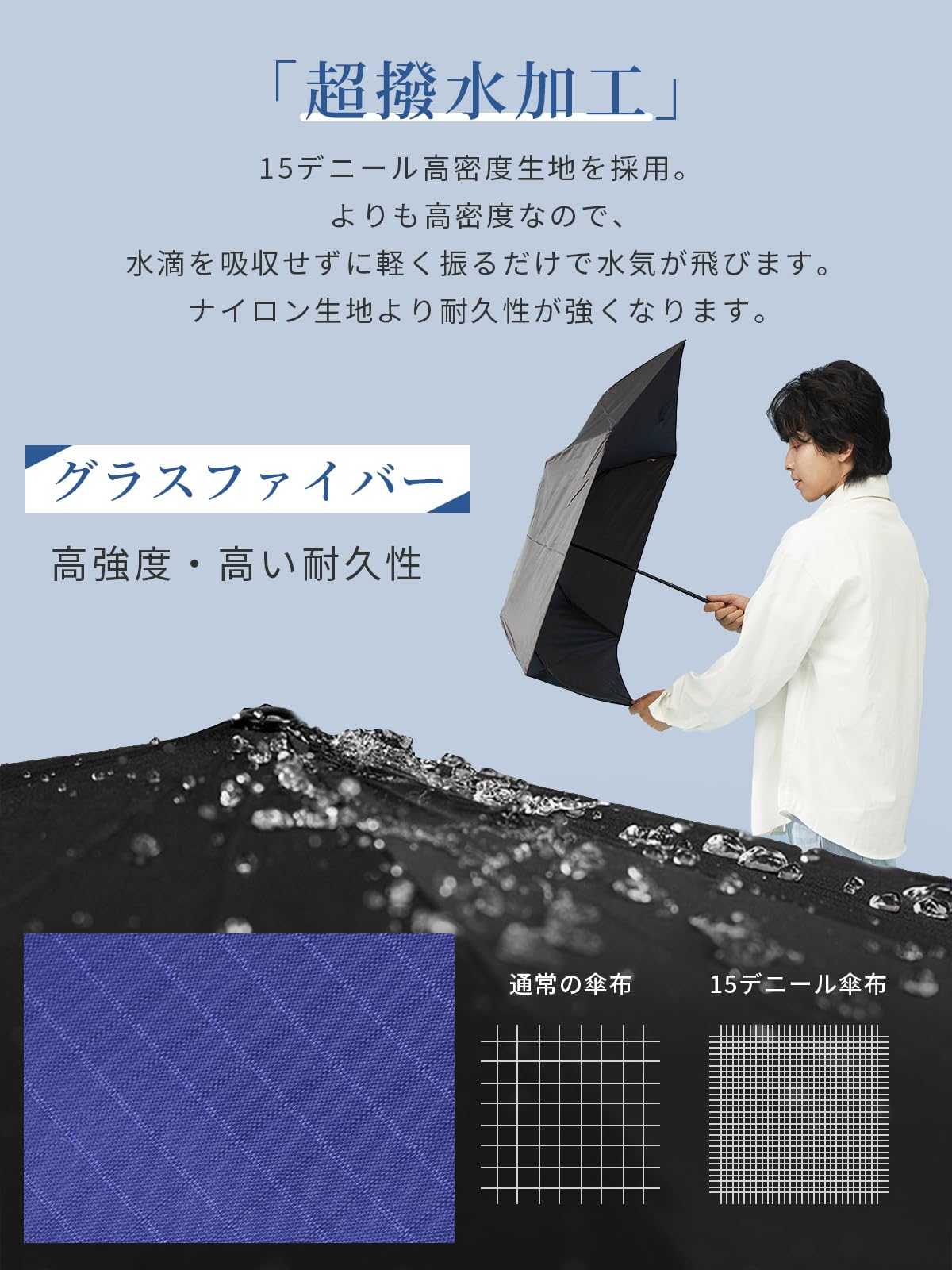 【超撥水加工・耐久性のある生地】15デニール生地を使い、細く強い糸で織り上げることにより、優れた撥水力を維持しながら薄く軽く改良することが出来ました。通常の生地より高密度なので、その表面は非常に細く、水滴を吸収することなく弾きます。そのため、水切れがとても良く、傘を差した後は軽く振っていただくだけで水気が飛び、カバンにも気楽にしまうことが可能。また、ポリエステル生地を使用しており、ナイロン生地より耐久性が強くなり、長くご利用できます。梅雨対策には欠かせない優秀なアイテムです!