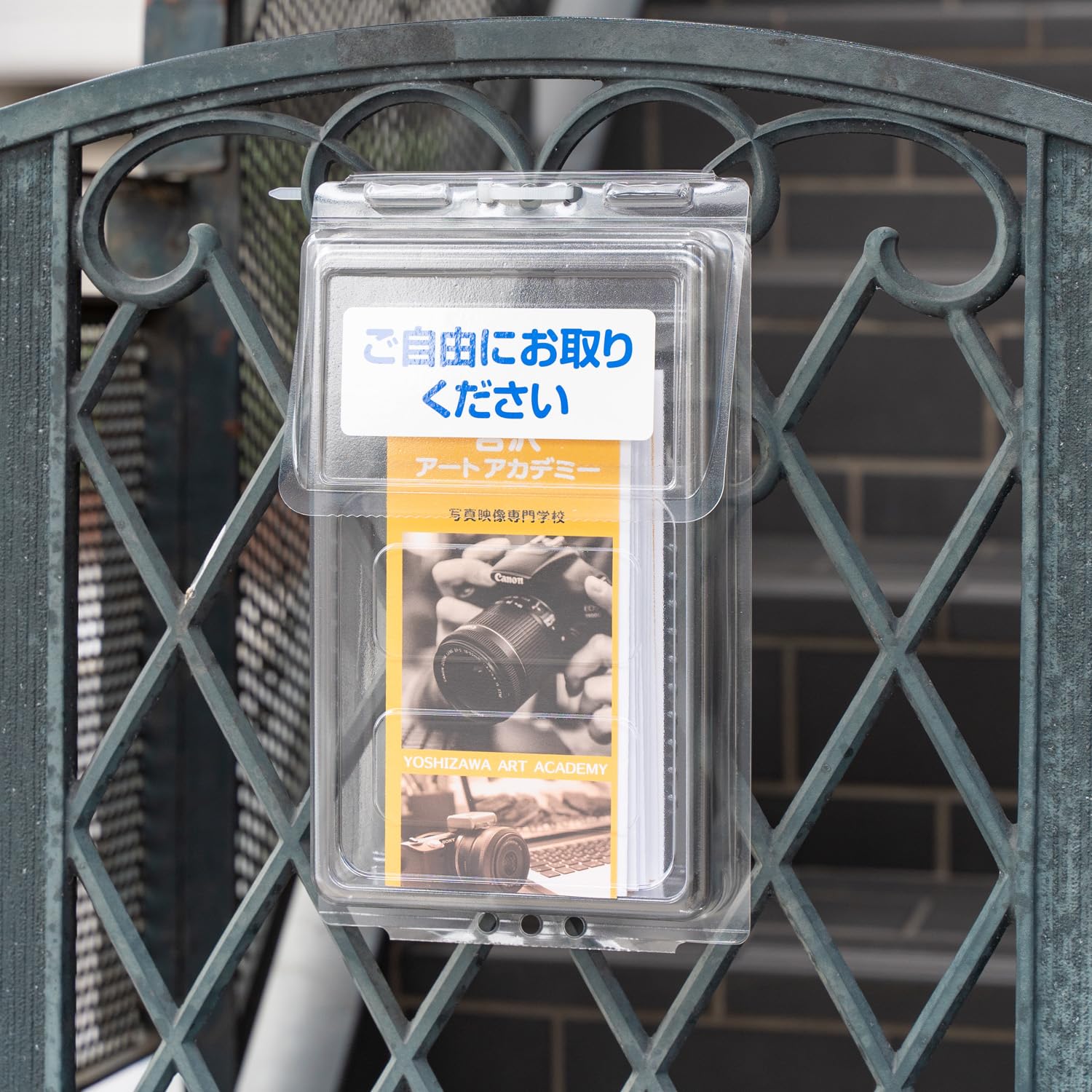 屋外でも使用可能な、ふた付きのパンフレットケース。