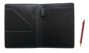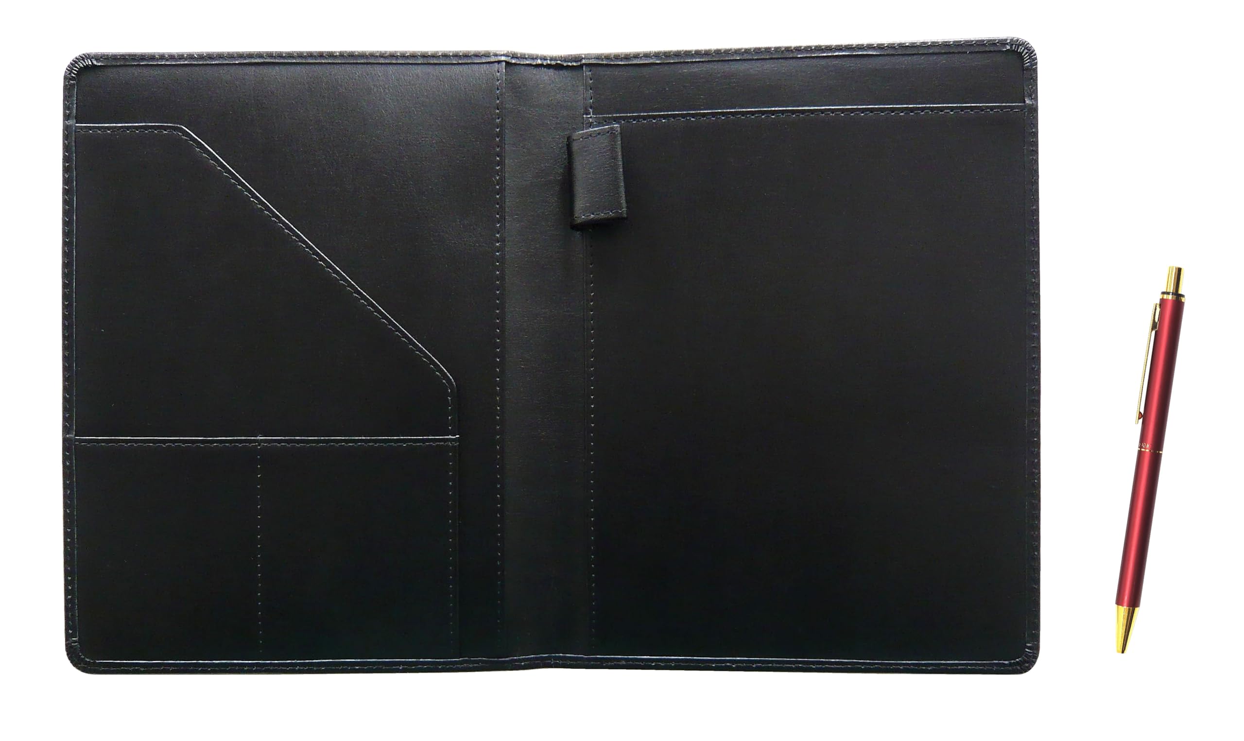 B6メモ帳用の再生牛革製ノートパッド。内側左は2段マチ付でミニポケット2列、内側右はB6レポート用紙をフラットに収納。マチには書類を収納可能。ペン差し付き。