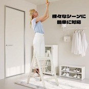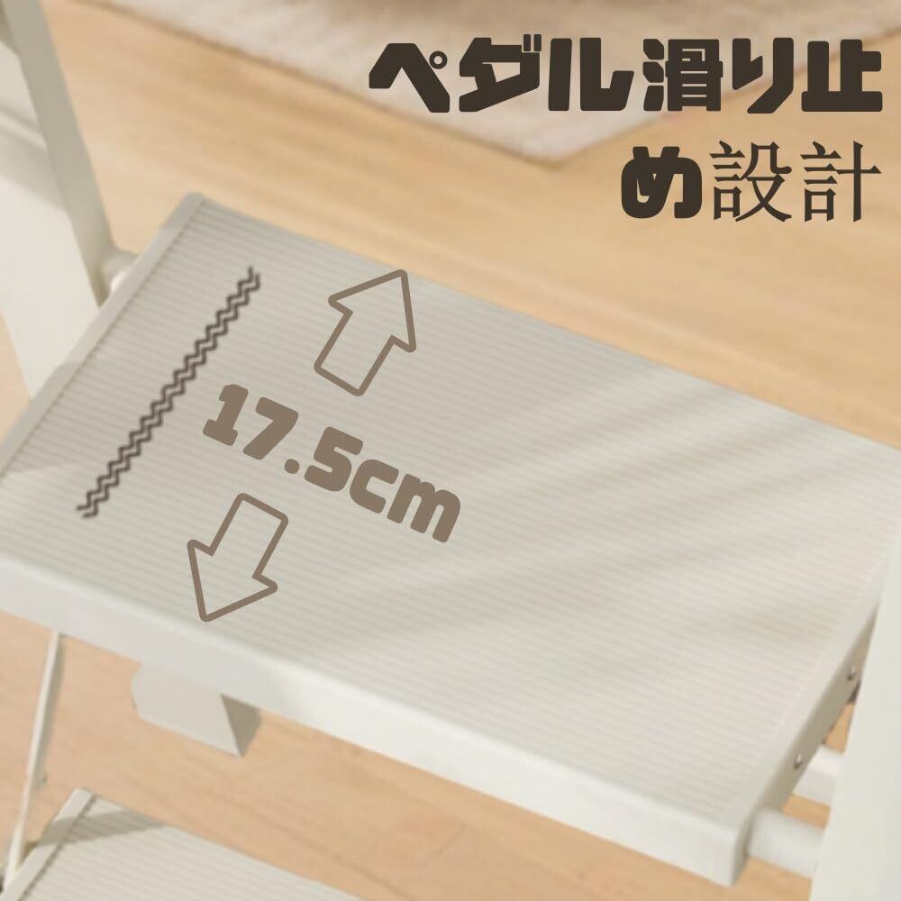 【幅広17cmステップ×滑り止め加工 – 安全性重視の設計】 踏み板は足裏全体を包み込む17cm幅で、滑り止めの細かい凹凸加工付き。丸みを帯びた角は、ケガ防止にも配慮。屋内外問わず、電球交換や洗車、ガーデニングなど幅広い作業に安心してお使いいただけます。