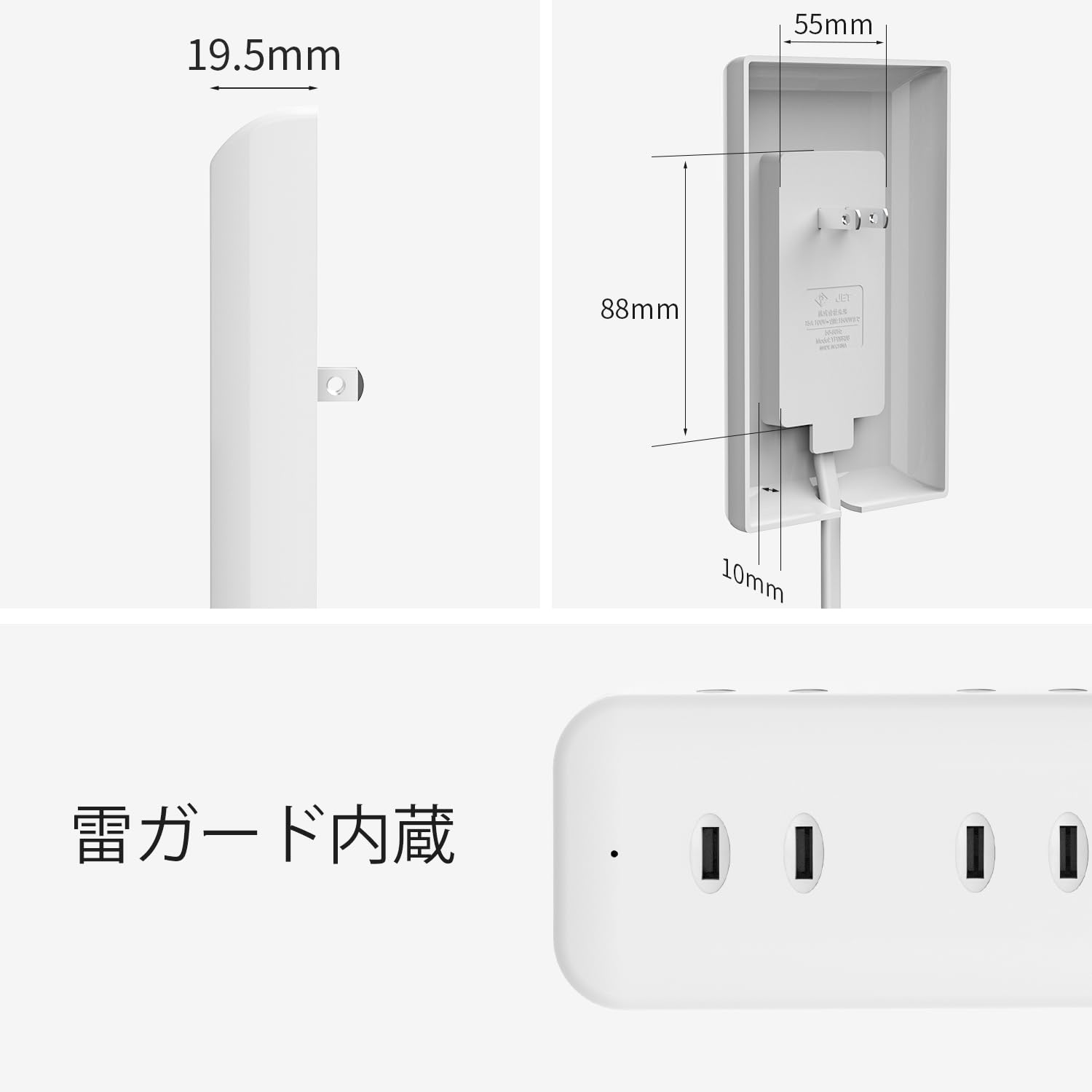「コンセントカバー付き」:コンセントプラグはカバーが付いています。プラグピンを含まないカバーサイズは約148.2㎜×95.2㎜×19.5㎜です。※ご注意:カバーの深さは約19.5㎜ですから、壁コンセントと本製品のサイズが異なる場合は、本製品を挿入する際にカバーと壁コンセントの間に少し隙間があります。購入前にサイズを確認してください。