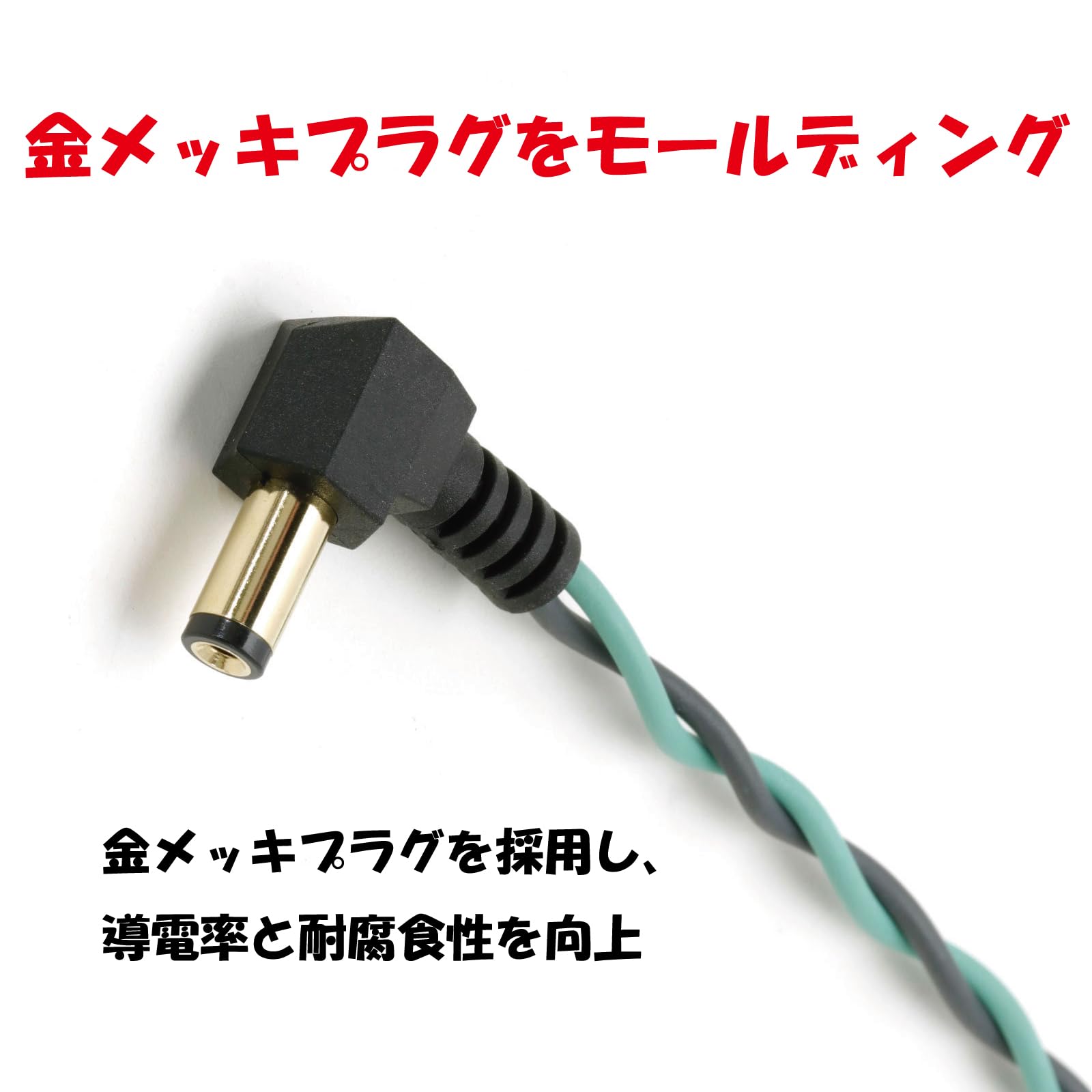 +DCプラグとしては稀の金メッキプラグを採用し、導電率と耐腐食性を向上。抜き差しの多いヘビーデューティーな使用環境を想定し、モールド加工で仕上げています。