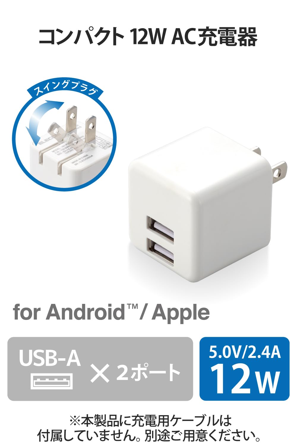 エレコム USB充電器 USB コンセント 合計12W (5V/2.4A) 2ポート USB-A コンパクト 折りたたみ式プラグ [iPhone15、Androidなど各種対応] ホワイト EC-AC3912WH