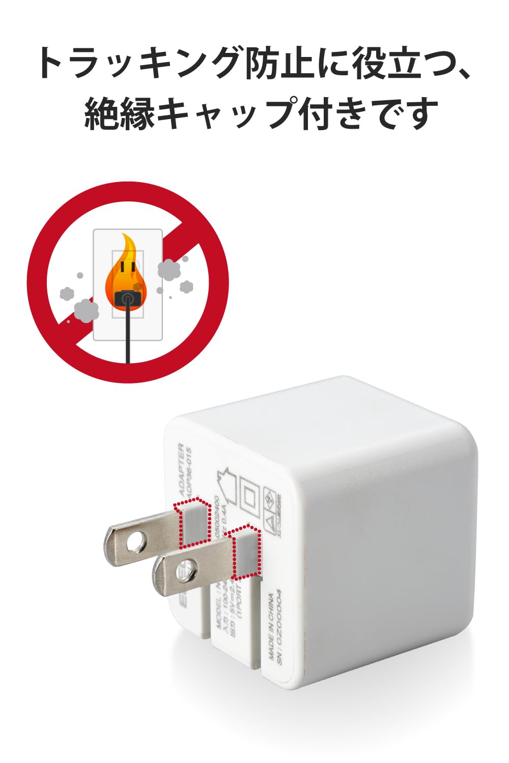 ■トラッキング現象による火災の防止に役立つ、絶縁キャップ付きのコンセントプラグを採用しています。 ※機器本体や充電器が濡れた状態で充電すると、異常な発熱・焼損の原因となり大変危険ですのでおやめください。
